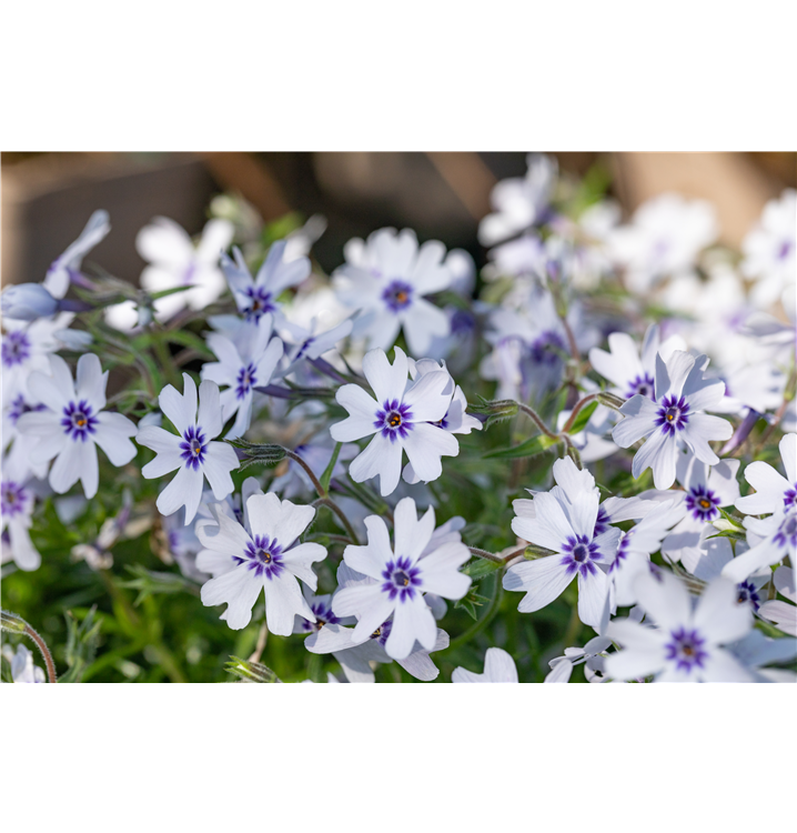 Phlox subulata 'Bavaria' bildet in Dolden angeordnete, blau-weiße Blüten ab April.