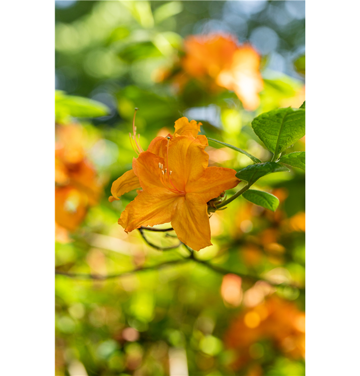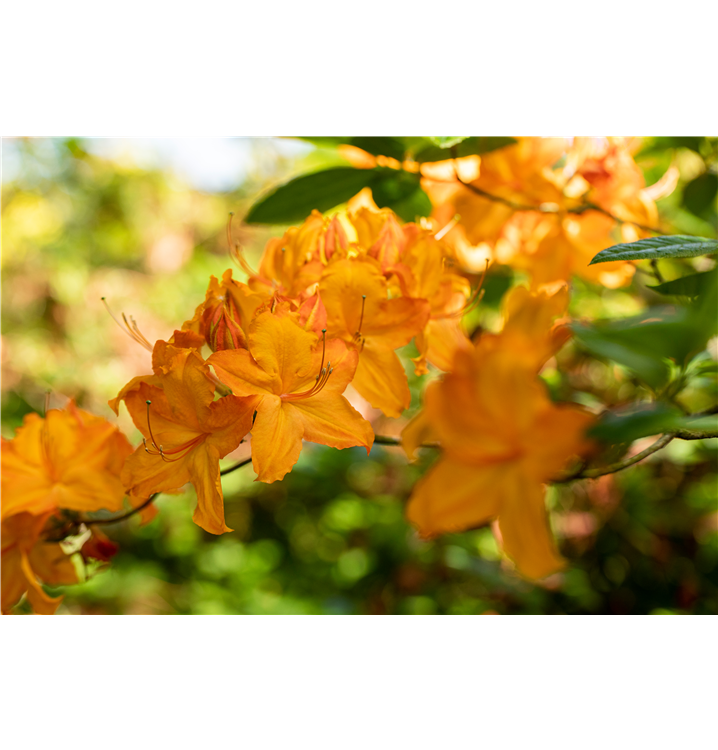 Die Sommergrüne Azalee 'Fireglow' (Rhododendron luteum) bringt von Ende Mai bis Mitte Juni ein wahres Meer aus orange-roten Blüten hervor. Dieses aufrecht, buschig, breit, kompakt, verzweigt wachsende Gehölz erreicht gewöhnlich eine Höhe von 2 - 3 m und eine Breite von 2 bis 3 m. Ein halbschattiger (bis schattiger) Standort und ein humoser, kalkfreier Boden schaffen optimale Bedingungen für ein gesundes Wachstum. Die Sommergrüne Azalee 'Fireglow' ist gut frostverträglich.