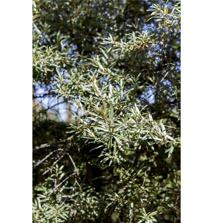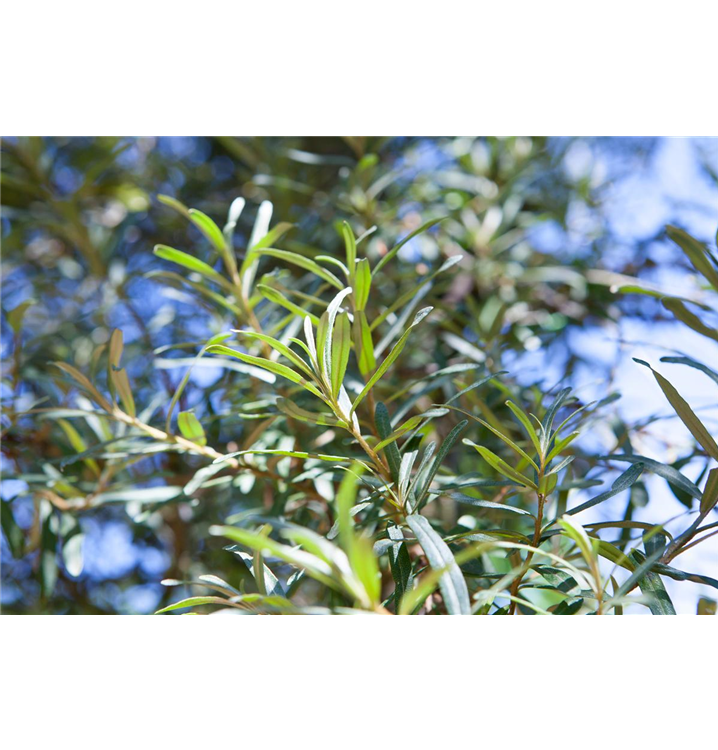 Die sommergrünen Blätter des Sanddorn, männl.s'Pollmix' sind silbrig, lanzettlich, wechselständig. Diese sind etwa 2 - 5 cm groß. Lange haftend.