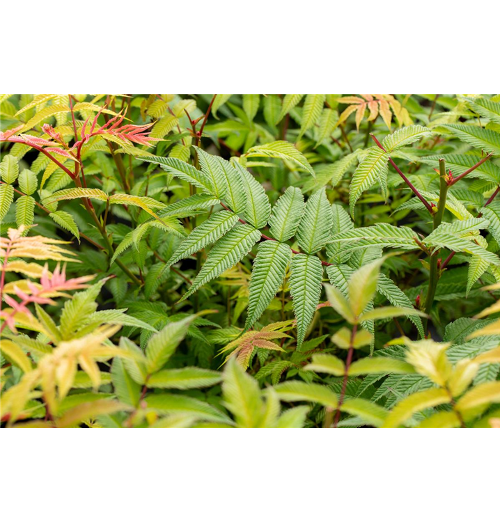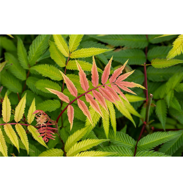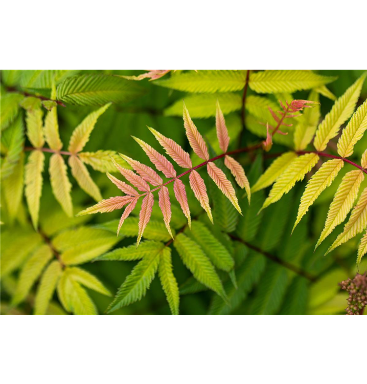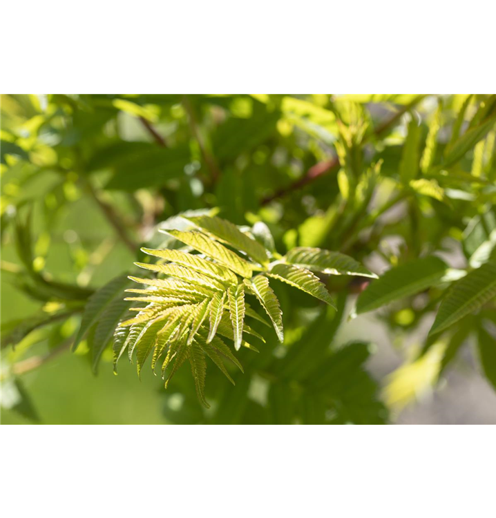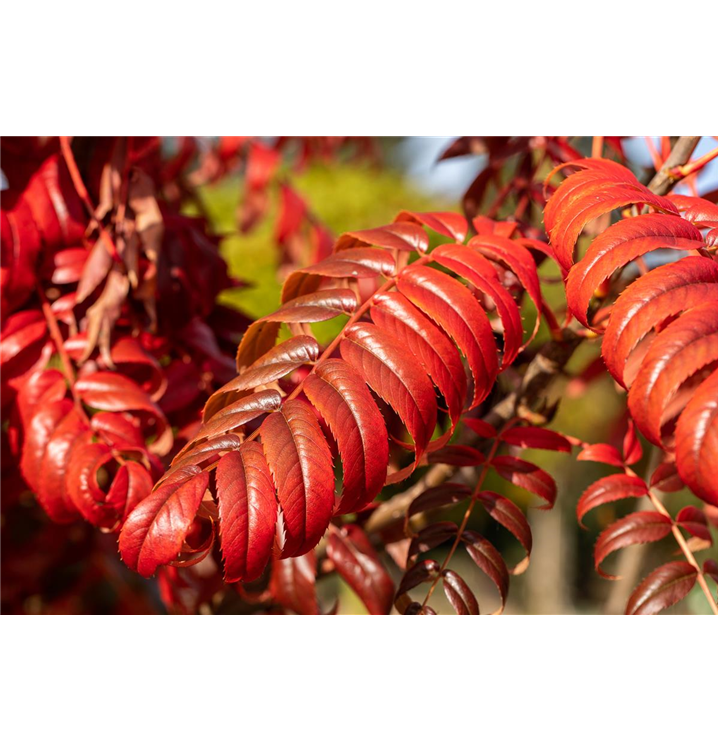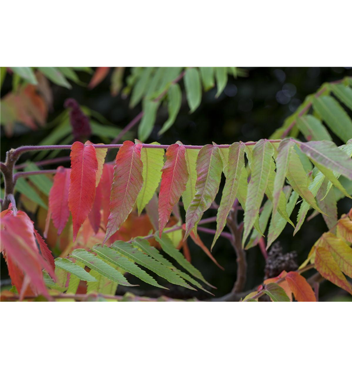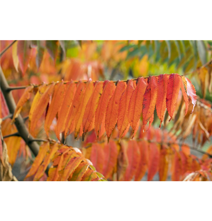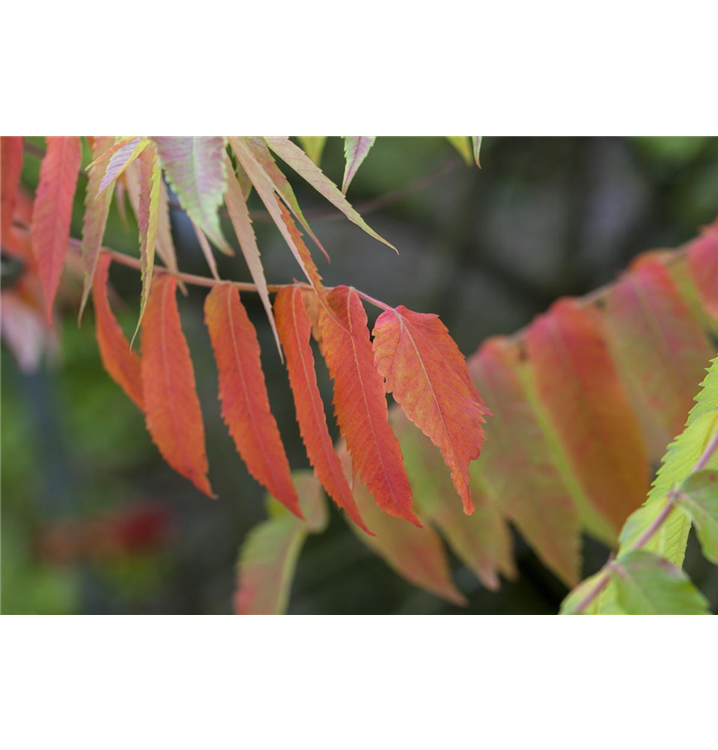 Die sommergrünen Blätter des Essigbaums sind mittelgrün, gefiedert, glänzend, wechselständig. Diese sind etwa 40 - 50 cm groß. Essigbaum zeigt sich leuchtend orange-rot im Herbst.