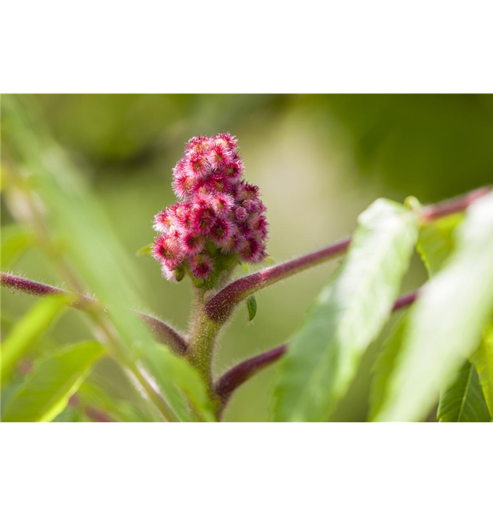 Die hellgrünen Blüten des Essigbaum erscheinen in Rispen von Juni bis Juli.