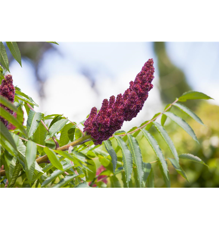 Der Essigbaum (Rhus typhina) ist ein mehrstämmiger, schirmförmiger Strauch mit dekorativen Früchten, die sehr lange haften. Die Blüten erscheinen je nach Sorte in verschiedenen Farben.