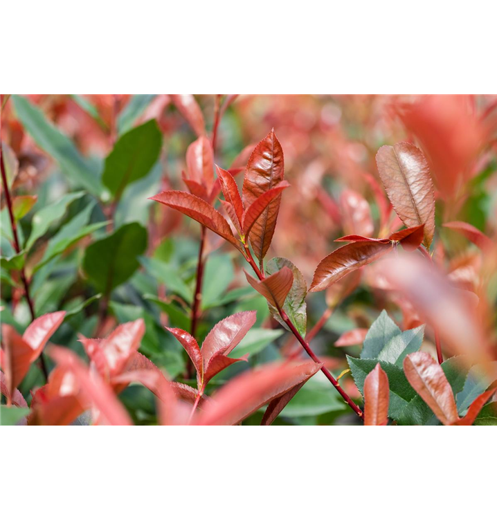 Die immergrünen Blätter der Glanzmispel 'Devils Dream'® sind dunkelgrün, lanzettlich, gesägt. Diese sind etwa 8 - 12 cm groß. Leuchtend roter Austrieb.