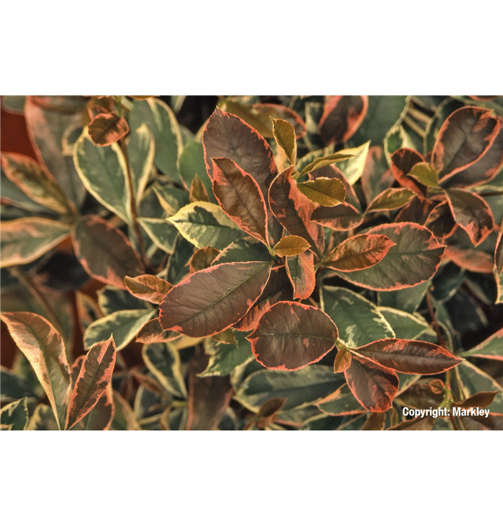 Hoher Blattschmuckwert. Die immergrünen Blätter der Glanzmispel 'Pink Marble'® sind dunkelgrün, lanzettlich, glänzend und weisen einen weißen Rand auf. Rosaroter Austrieb.