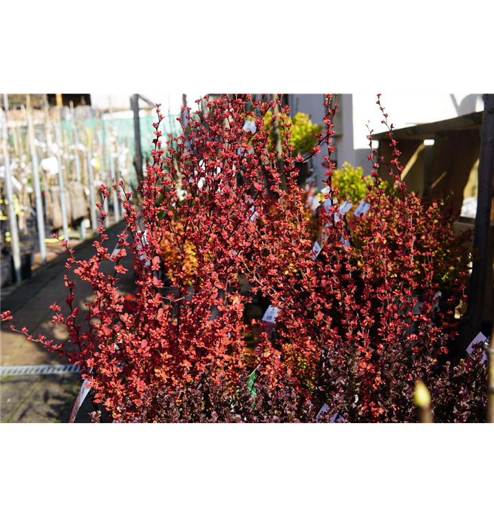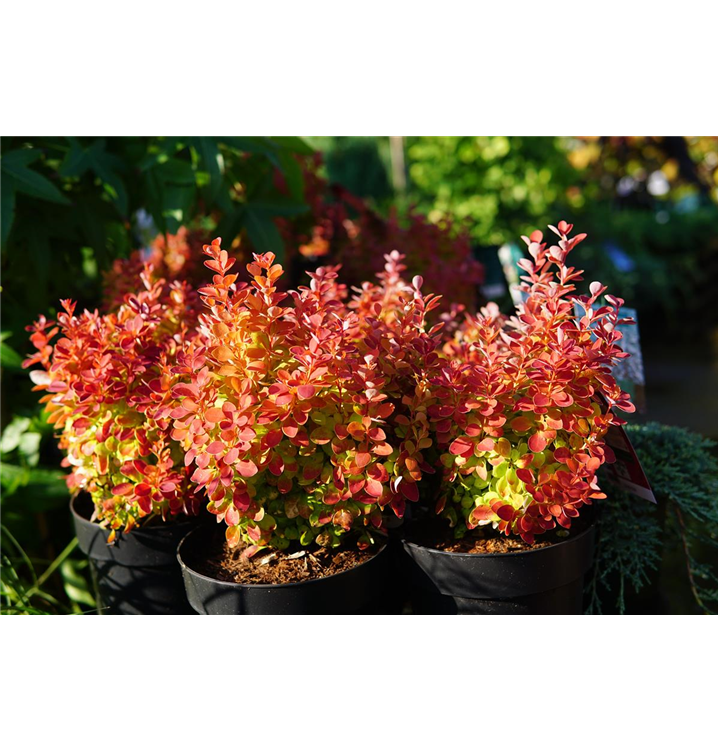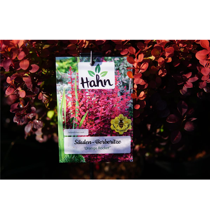 Die Berberitze 'Orange Rocket'® (Berberis thunbergii) ist ein dichter, überhängender, verzweigter, aufrechter, kompakter Strauch oder Kleinstrauch mit dekorativen, korallenroten Früchten, die sehr lange haften. Diesen voraus bringt sie im Mai gelbe Blüten hervor. Zudem trägt die Berberitze 'Orange Rocket'®, eiförmige, mittelgrüne, rot gezeichnete Blätter. An einem sonnigen bis halbschattigen Standort mit durchlässigem, humosem, saurem Boden erreicht sie gewöhnlich eine Höhe von ca. 1,5 m und wird ca. 60 cm breit.