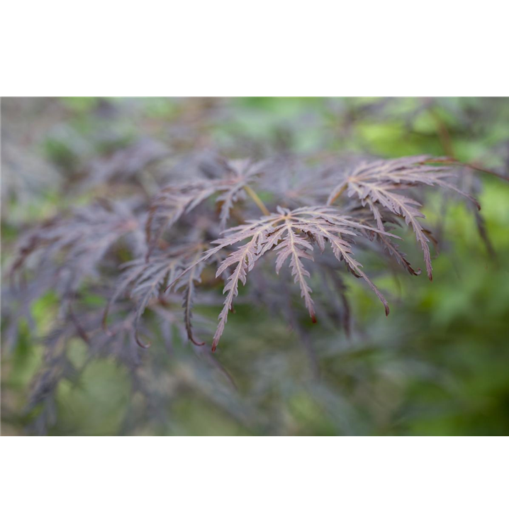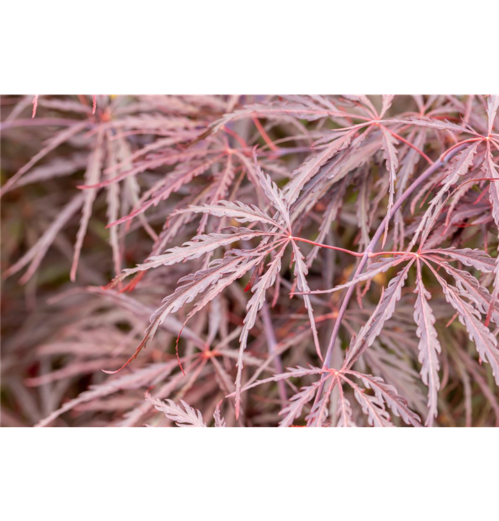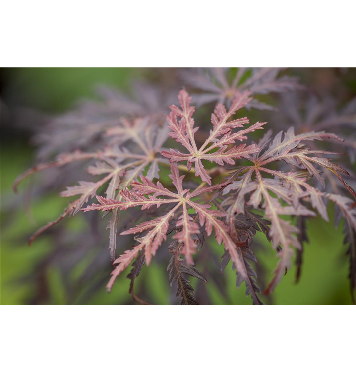 Die sommergrünen Blätter des Fächerahorns 'Tamukeyama' sind purpurrot, gefingert. Diese sind etwa 6 - 11 cm groß. Fächerahorn 'Tamukeyama' zeigt sich leuchtend karminrot im Herbst.