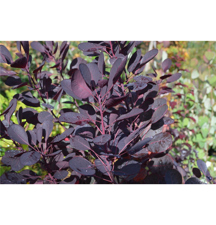 Hoher Blattschmuckwert. Die sommergrünen Blätter des Zwerg-Perückenstrauchs 'Lilla'® sind dunkelrot, rundlich, wechselständig. Diese sind etwa 3 - 8 cm groß. Zwerg-Perückenstrauch 'Lilla'® zeigt sich leuchtend orangegelb bis scharlachrot im Herbst.