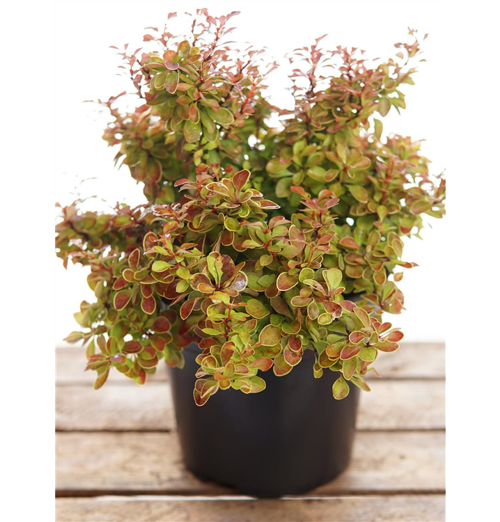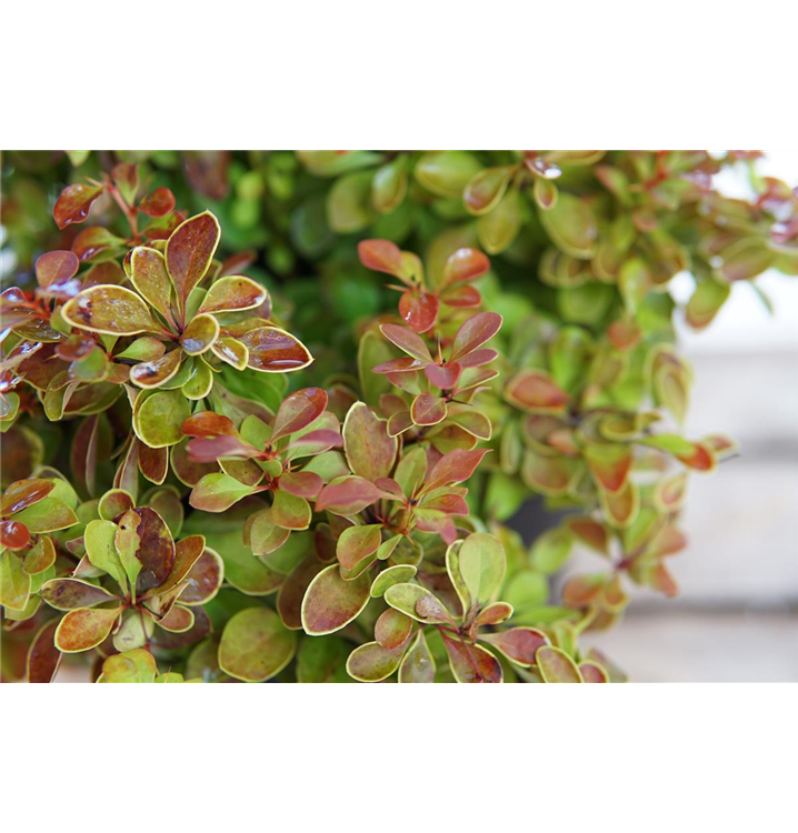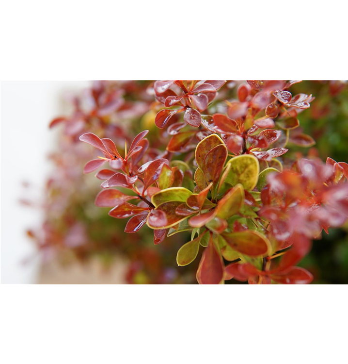 Berberitze 'Ruby Star' ist ein dicht, überhängend, verzweigt und kompakt wachsender Strauch. Sie erreicht gewöhnlich eine Höhe von 20 - 30 cm und wird ca. 30 - 40 cm breit.