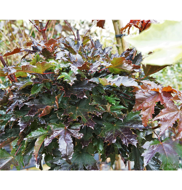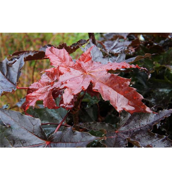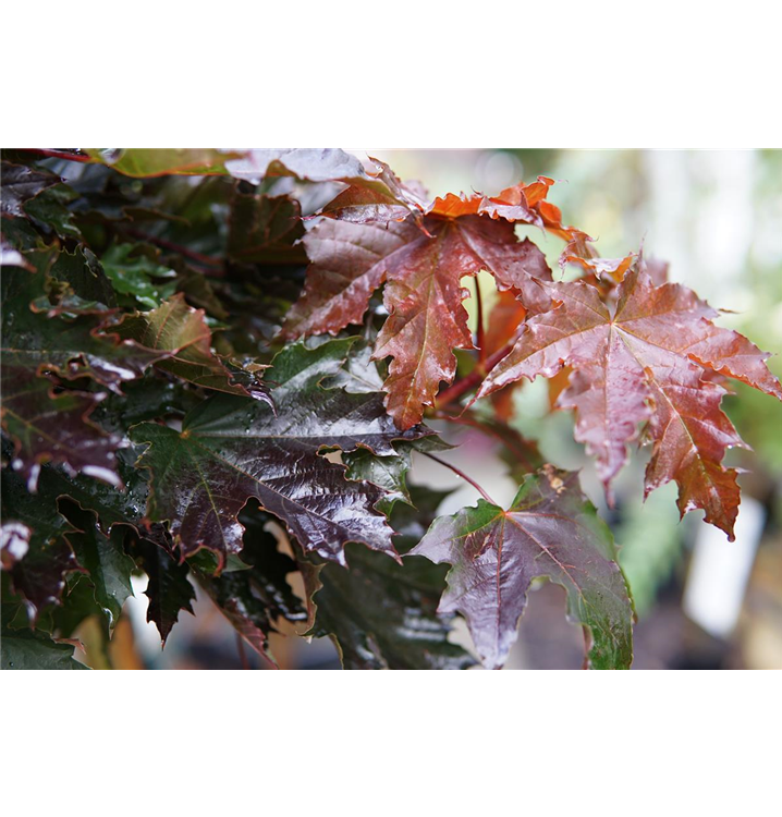 Hoher Blattschmuckwert. Die sommergrünen Blätter des Spitzahorns 'Crimson Sentry' sind purpurrot, gezähnt, gelappt. Diese sind etwa 15 - 20 cm groß. Scharlachroter Austrieb.