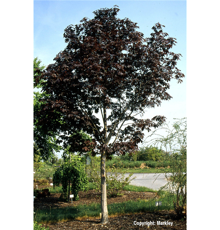 Der Spitzahorn 'Crimson Sentry' (Acer platanoides) ist ein dichter, schlanker, Großbaum oder Kleinbaum mit dekorativen sommergrünen, purpurroten Blättern. Auch der scharlachrote Austrieb ist sehr schön.