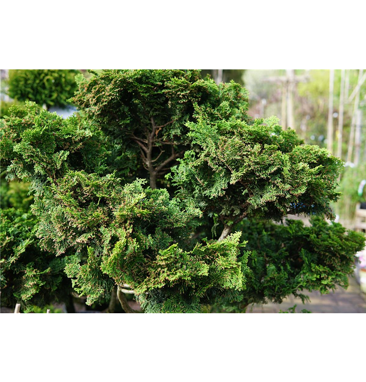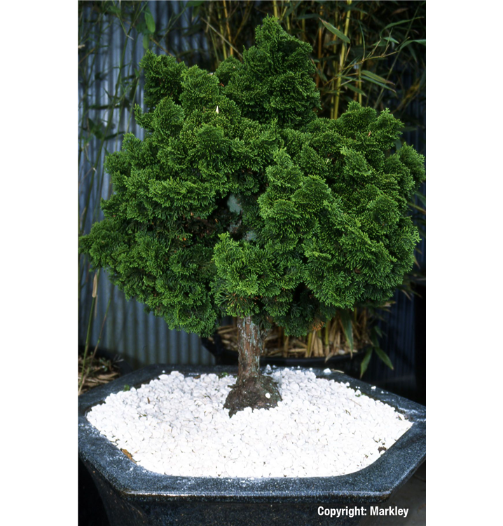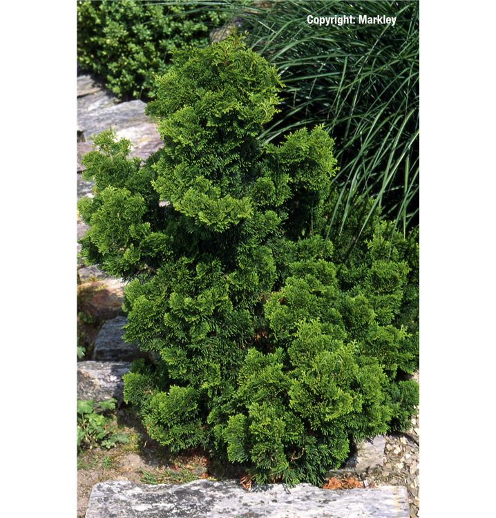 Kleine Muschelzypresse 'Nana Gracilis' ist ein rundlich und buschig wachsender Strauch. Sie erreicht gewöhnlich eine Höhe von 2 - 2,5 m und wird ca. 1,5 - 2 m breit. Langsam wachsend. In der Regel wächst sie 5 cm pro Jahr.