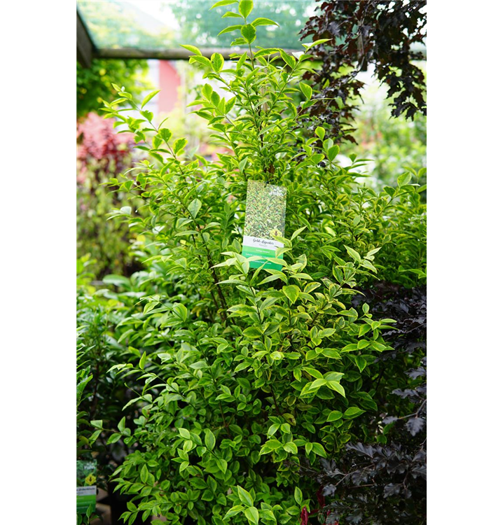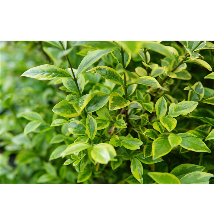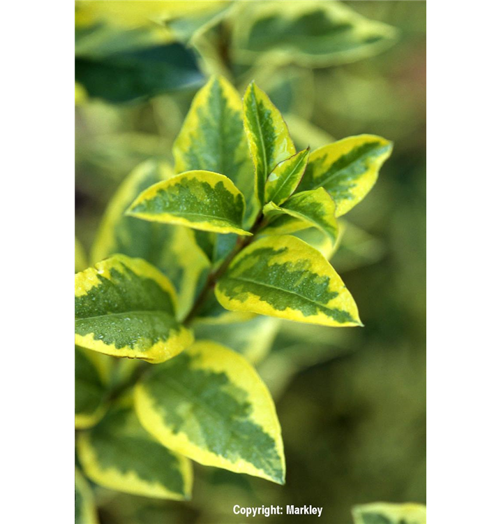 Der Goldliguster 'Aureum' (Ligustrum ovalifolium) ist ein aufrechter, straffer, Strauch mit dekorativen wintergrünen, glänzenden, eiförmigen, dunkelgrünen Blättern mit einem goldgelben Rand.