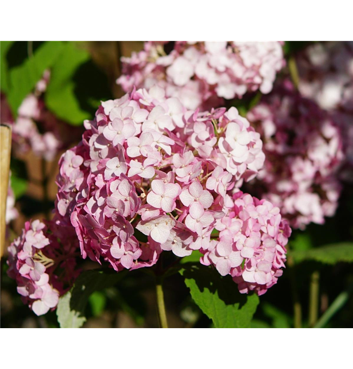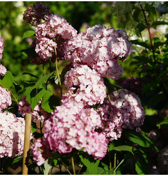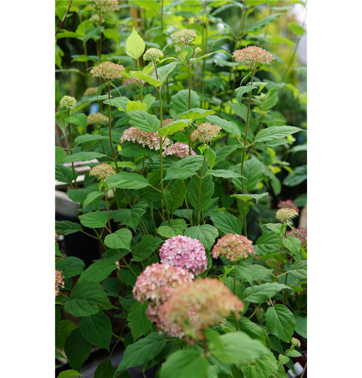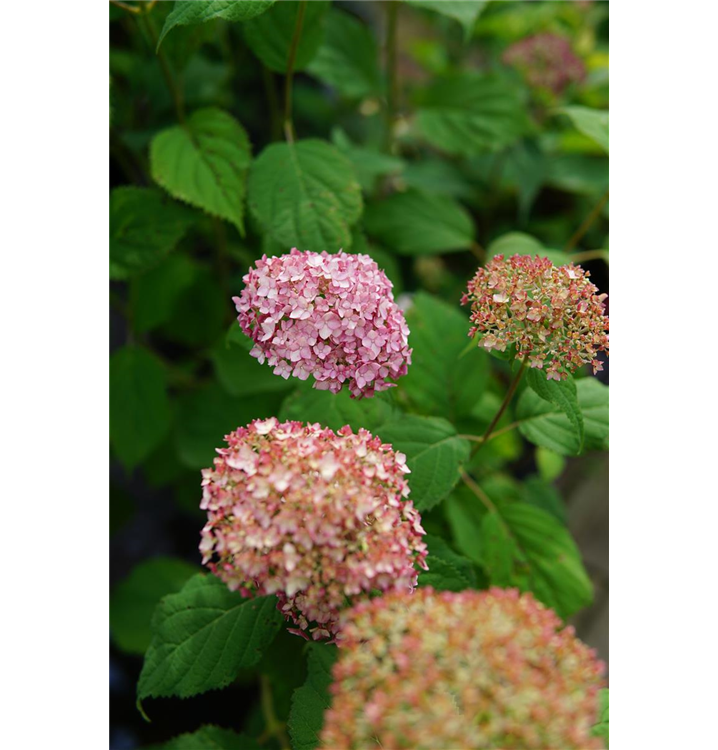 Die Ballhortensie 'Candybelle® Bubblegum' (Hydrangea arborescens) ein kompakter Kleinstrauch, der, je nach Sorte, ballförmige Blüten in verschiedenen Farben hervorbringt. An einem sonnigen bis halbschattigen Standort mit durchlässigem, humosem, saurem Boden erreicht sie gewöhnlich eine Höhe von ca. 1 m und wird ca. 1 m breit.
