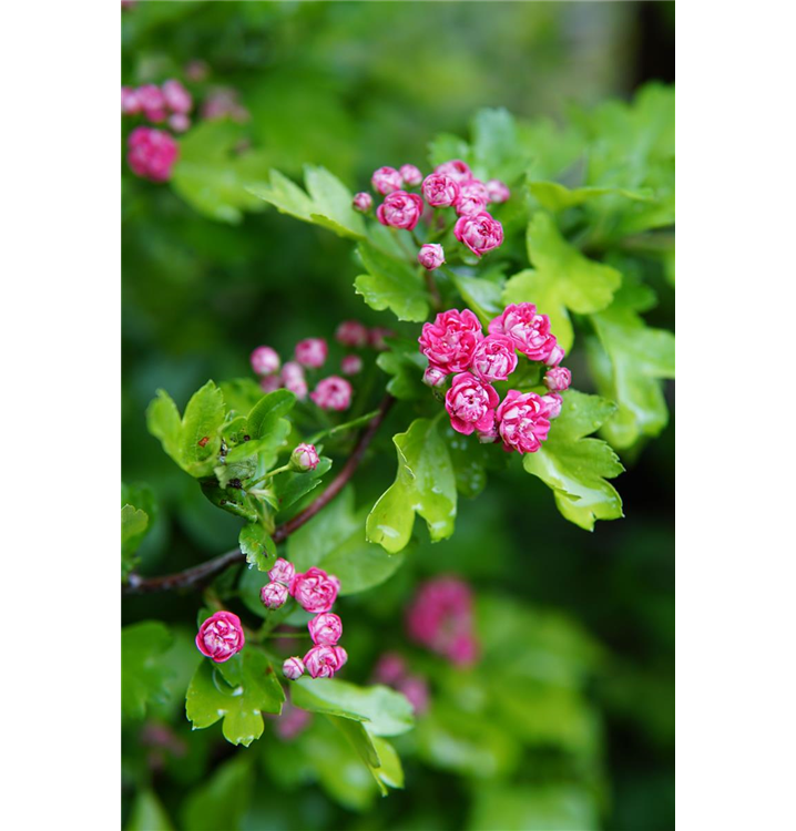 Der Echte Rotdorn 'Paul´s Scarlet' (Crataegus laevigata) ist ein kegelförmiger, breiter Großstrauch, der karminrote, in Rispen angeordnete Blüten hervorbringt. Sie erscheinen von Mai bis Juni. Seine Rinde ist dunkelgrau, abblätternd, schuppenförmig. An einem sonnigen bis halbschattigen Standort mit durchlässigem, nährstoffreichem, lehmigem Boden erreicht er gewöhnlich eine Höhe von ca. 8 m und wird ca. 6 m breit.