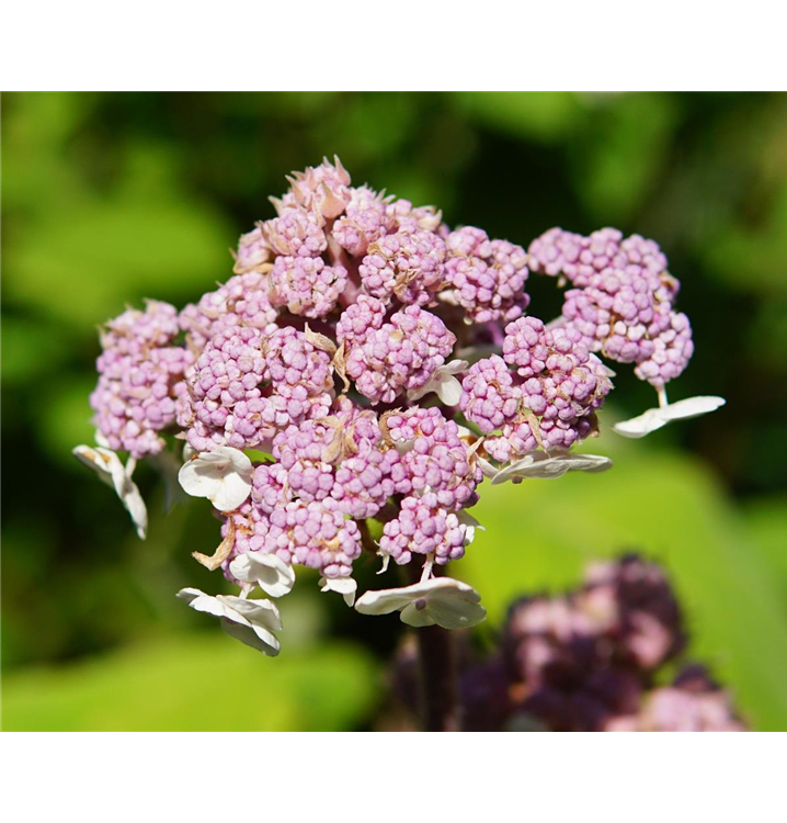 Hydrangea aspera 'Macrophylla' bringt von Juli bis August violette, rosa-blaue Blüten hervor. Diese werden etwa 15 - 30 cm groß.