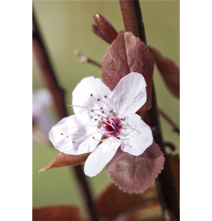 Die Kirschpflaume (Prunus cerasifera) ein buschiger, dichter Kleinbaum, der, je nach Sorte, schalenförmige Blüten in verschiedenen Farben hervorbringt. Ihre Rinde ist schwarz. An einem sonnigen bis halbschattigen Standort mit kalkhaltigem, nährstoffreichem, lehmigem Boden erreicht sie gewöhnlich eine Höhe von ca. 8 m und wird ca. 6 m breit.