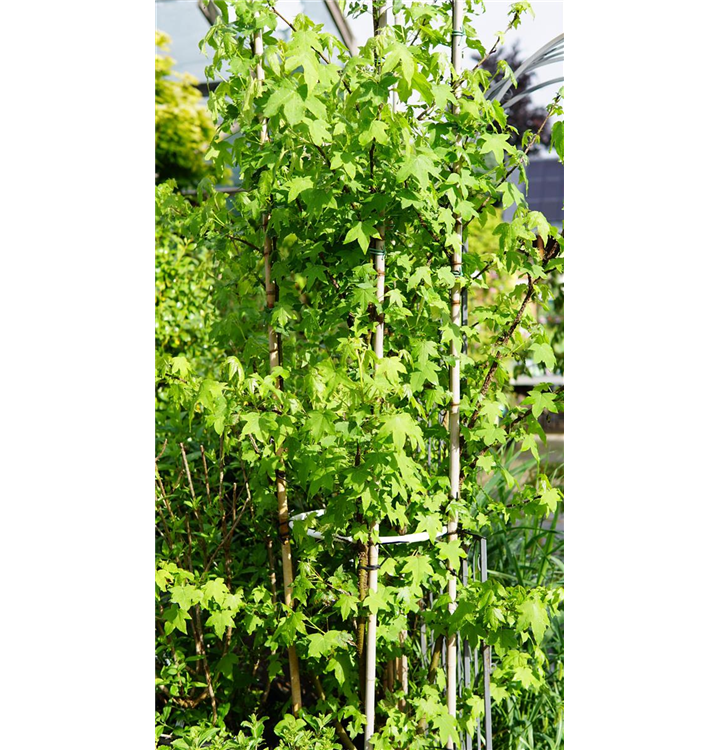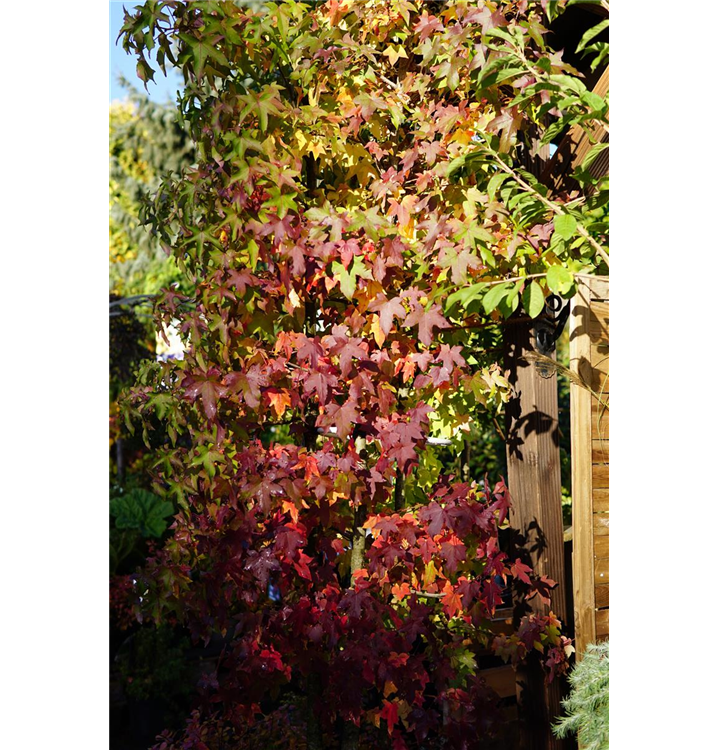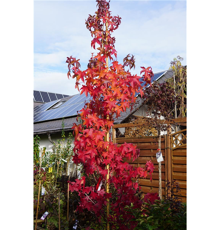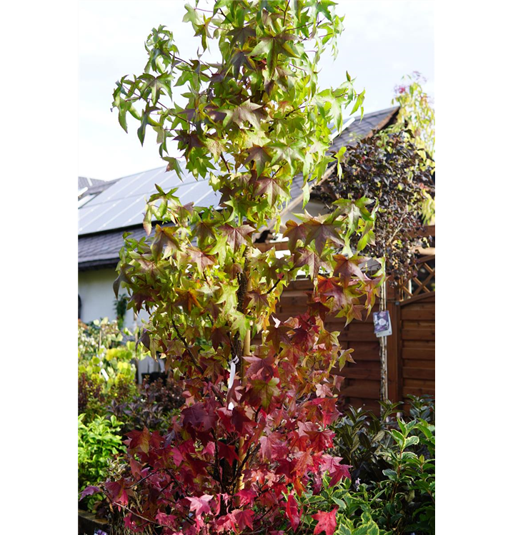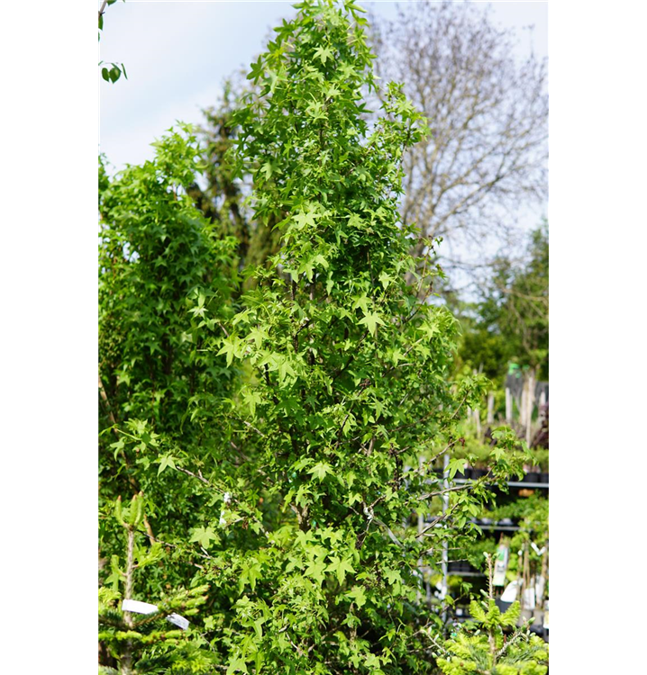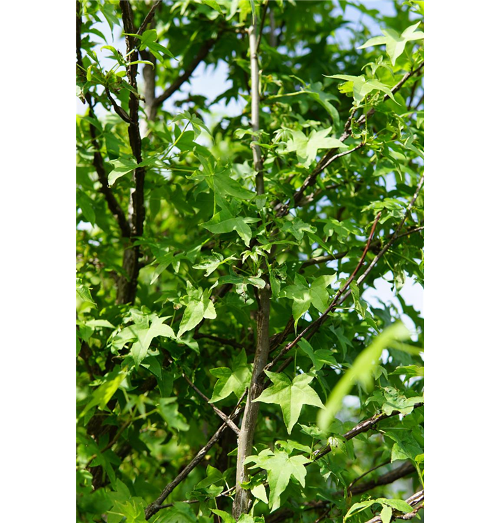 Amerikanischer Amberbaum ist ein kegelförmig und aufrecht wachsender Baum mit lichtdurchlässiger Krone. Er erreicht gewöhnlich eine Höhe von 10 - 30 m und wird ca. 6 - 12 m breit. In der Regel wächst er 30 - 35 cm pro Jahr.