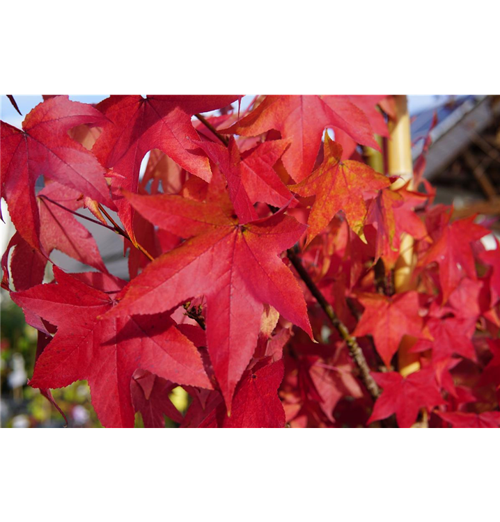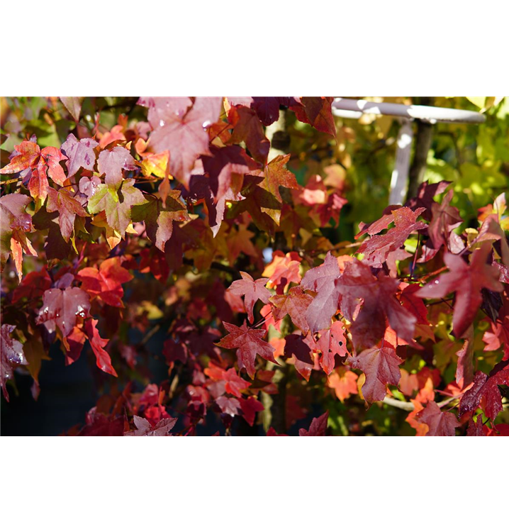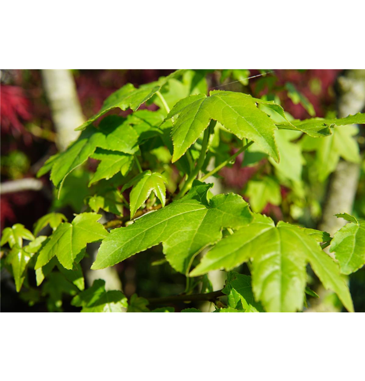 Die sommergrünen Blätter des Amerikanischen Amberbaums sind mittelgrün, gefingert, wechselständig. Diese sind etwa 12 - 15 cm groß. Amerikanischer Amberbaum zeigt sich leuchtend purpurrot bis rot-orange im Herbst.