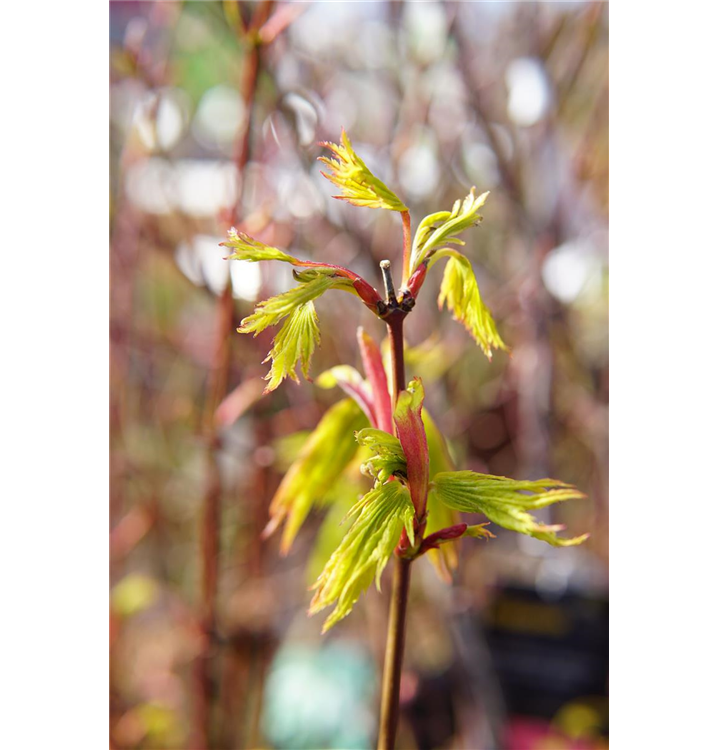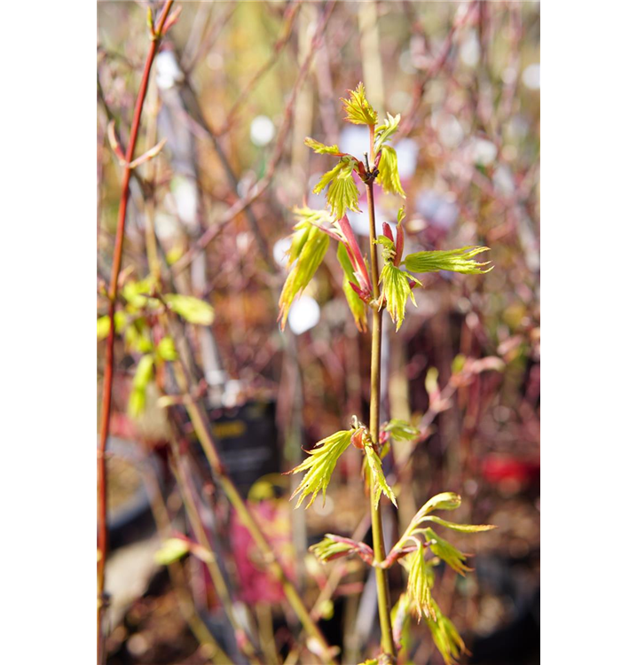 Die sommergrünen Blätter des Fächerahorns 'Jordan'(s) sind gelb-grün, gelappt. Gelber Austrieb. Fächerahorn 'Jordan'(s) zeigt sich leuchtend gelb im Herbst.