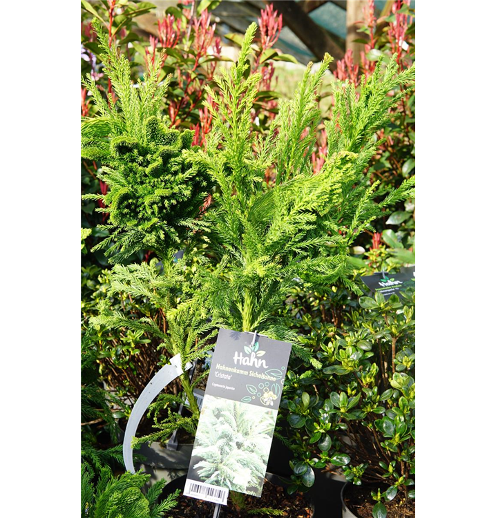 Die Hahnenkamm-Sicheltanne 'Cristata' (Cryptomeria japonica) ist ein Kleinbaum, welcher kegelförmig, breit wächst und gewöhnlich eine Höhe von ca. 15 m und eine Breite von ca. 5 m erreicht. Ihre nadelförmigen Blätter haben eine dunkelgrüne Färbung. Dieses Gehölz ist gut frostverträglich. Sie bevorzugt sauren, lehmigen Boden in sonniger bis halbschattiger windgeschützter Lage.