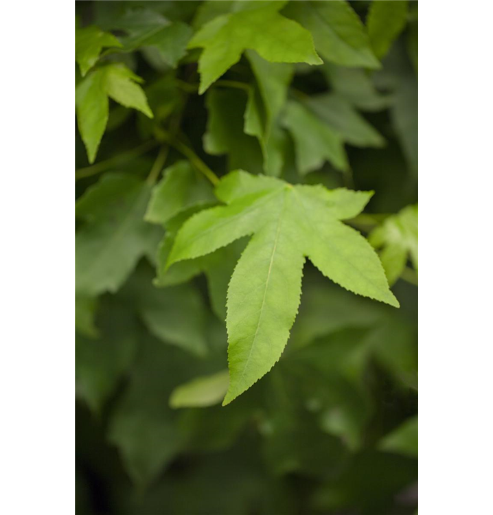 Die sommergrünen Blätter des Kugel-Amberbaums 'Gum Ball' sind mittelgrün, gefingert, wechselständig. Diese sind etwa 12 - 15 cm groß. Kugel-Amberbaum 'Gum Ball' zeigt sich leuchtend purpurrot bis rot-orange im Herbst. Lange haftend.