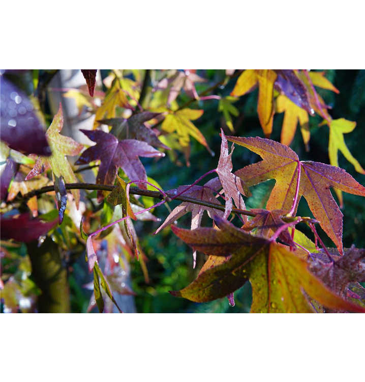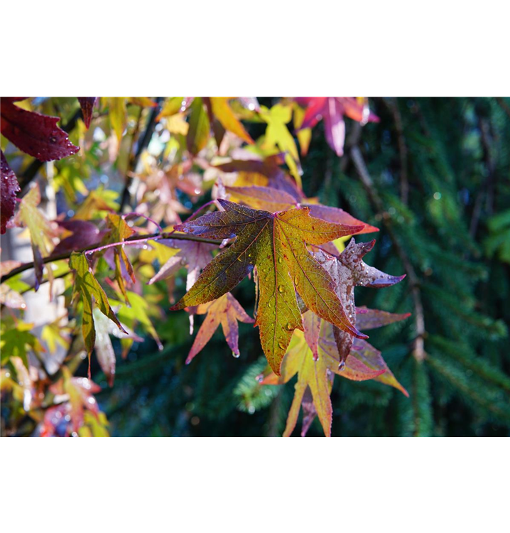 Besonders dekorativ sind die braunen, runden Früchte von Liquidambar styraciflua 'Worplesdon'. Diese erscheinen ab September. Haften sehr lange.