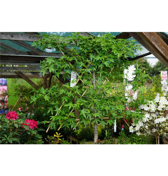 Amberbaum 'Worplesdon' ist ein kegelförmig und aufrecht wachsender Baum mit lichtdurchlässiger Krone. Er erreicht gewöhnlich eine Höhe von 12 - 15 m und wird ca. 6 - 8 m breit. In der Regel wächst er 30 - 35 cm pro Jahr.