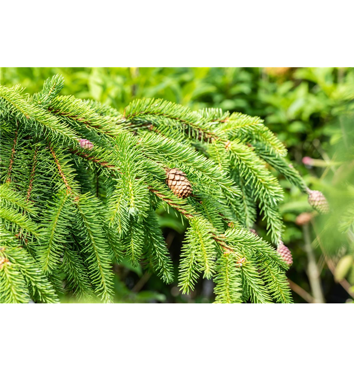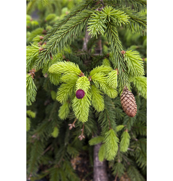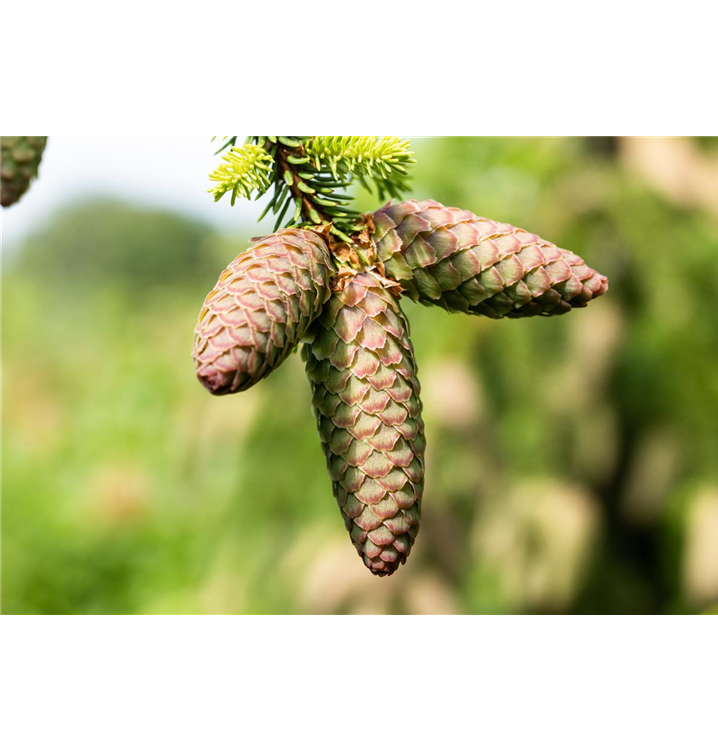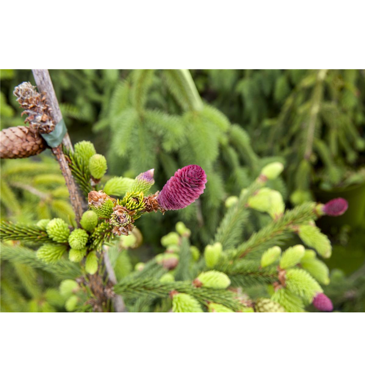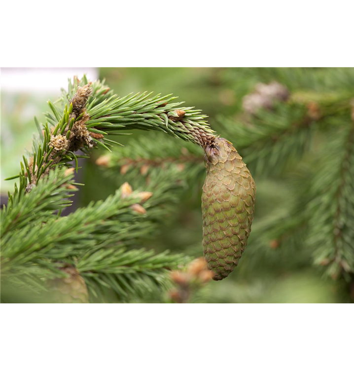 Zapfen-Fichte 'Acrocona' ist ein kegelförmig, breit wachsender, malerischer Kleinbaum. Sie erreicht gewöhnlich eine Höhe von 2 - 5 m und wird ca. 2 - 4 m breit. Langsam wachsend. In der Regel wächst sie 8 - 10 cm pro Jahr.