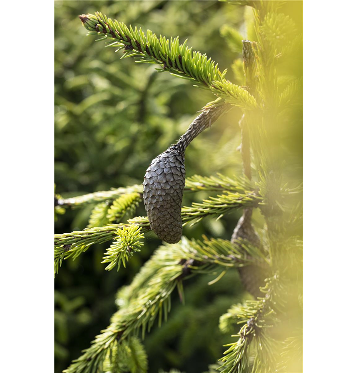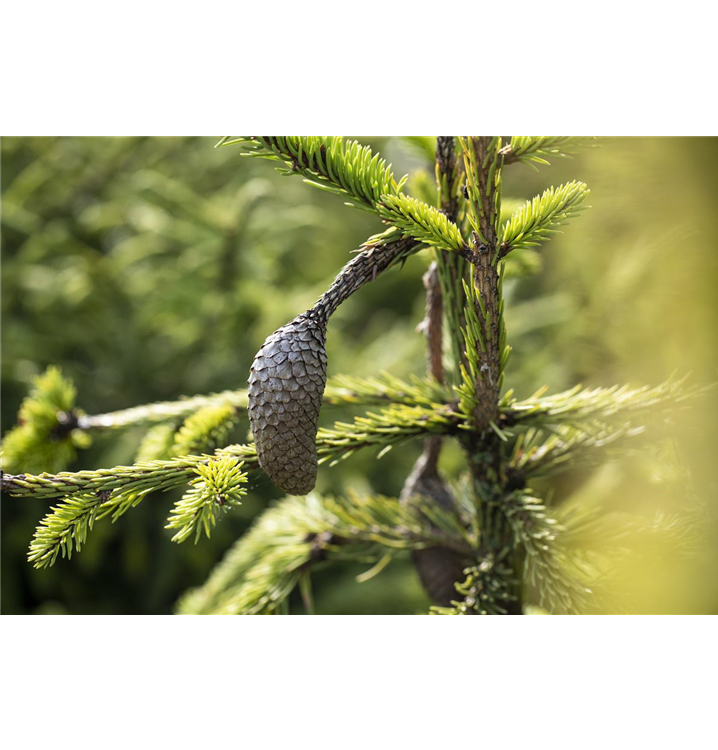Zapfen-Fichte 'Acrocona' ist ein kegelförmig, breit wachsender, malerischer Kleinbaum. Ihre dunkelgrünen Blätter sind nadelförmig . An einem sonnigen bis halbschattigen Standort mit sandigem, lehmigem, schwachsaurem Boden erreicht sie gewöhnlich eine Höhe von ca. 5 m und wird ca. 4 m breit.