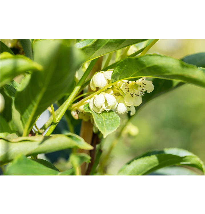 Actinidia arguta 'Issai' bildet schalenförmige, in Dolden angeordnete, weiße Blüten ab Juni.