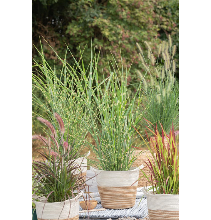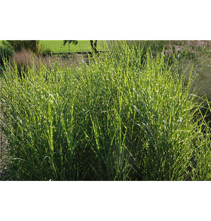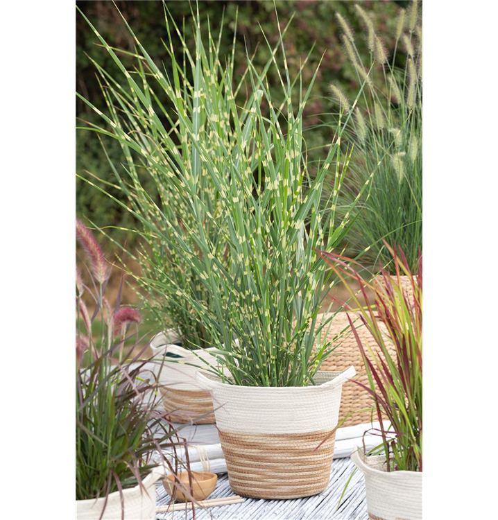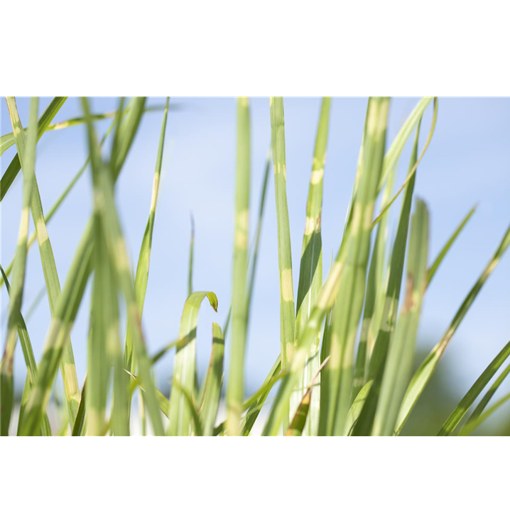 Das Garten-Zebraschilf 'Strictus' (Miscanthus sinensis) ist mit seiner gelb-grünen Blattfärbung ein dekoratives Gestaltungselement im Garten, welches sich an einem sonnigen Standort mit einem möglichst durchlässigen, humosen, nährstoffreichen Boden am wohlsten fühlt. Die rot-braunen Blütenwedel schmücken die aufrecht wachsende Pflanze ab Herbst. Bei günstigen Bedingungen erreicht dieses winterharte Gras eine Höhe von ca. 1,5 m und wird bis zu 80 cm breit.
