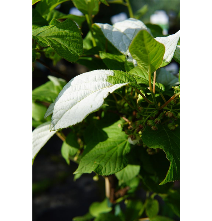 Hoher Blattschmuckwert. Die sommergrünen Blätter des Scharfzähnigen Strahlengriffels sind mehrfarbig, eiförmig, wechselständig. Diese sind etwa 10 - 15 cm groß.