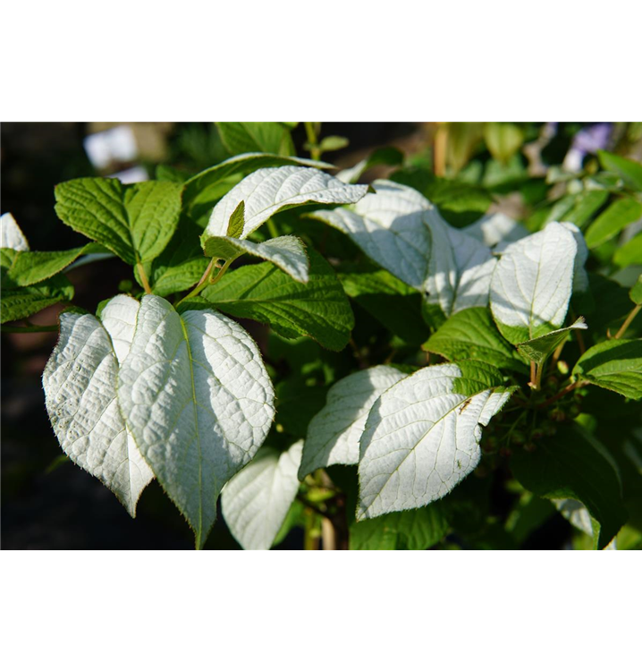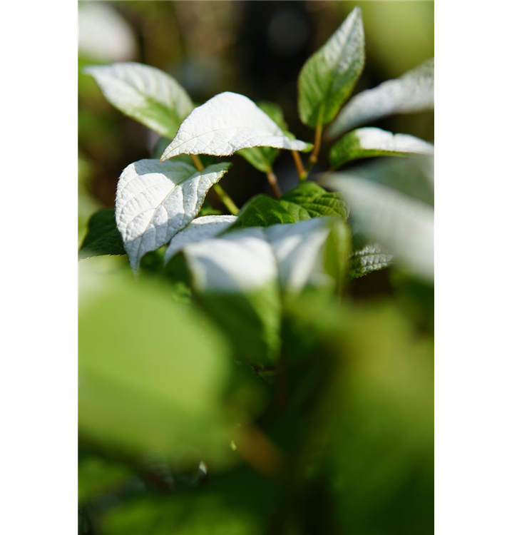 Der Scharfzähnige Strahlengriffel (Actinidia kolomikta) ist eine kletternde, Gartenpflanze mit dekorativen sommergrünen, eiförmigen, mehrfarbigen Blättern.
