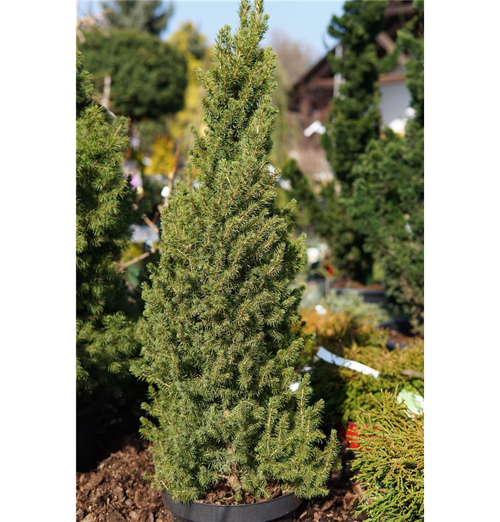 Zuckerhutfichte 'Conica Perfecta' ist ein aufrecht und kegelförmig wachsender Baum oder Strauch. Sie erreicht gewöhnlich eine Höhe von 2 - 5 m und wird ca. 2 - 2,5 m breit.