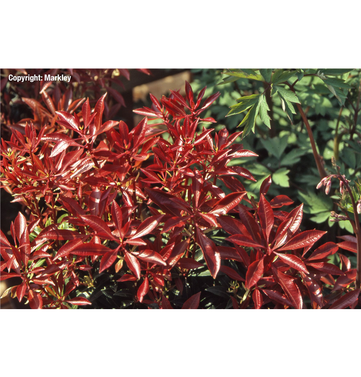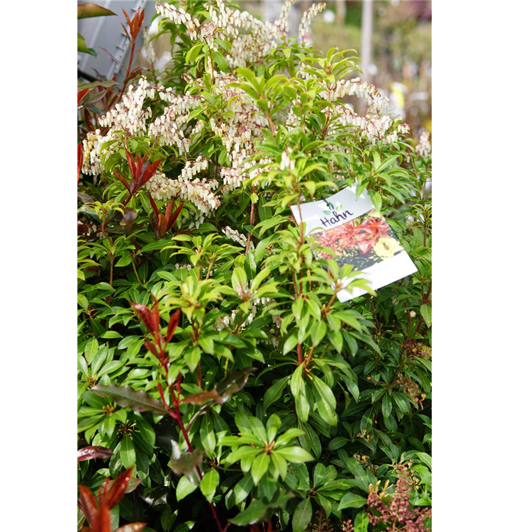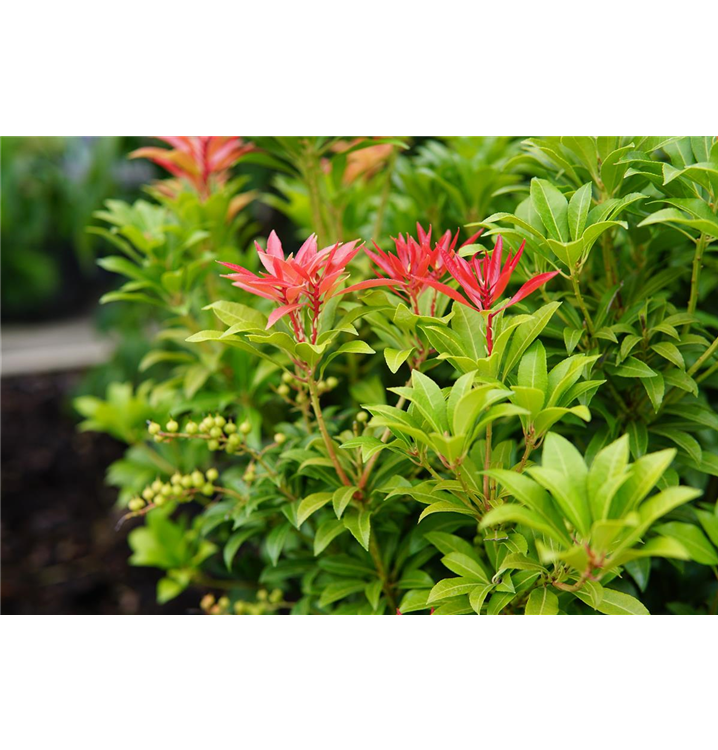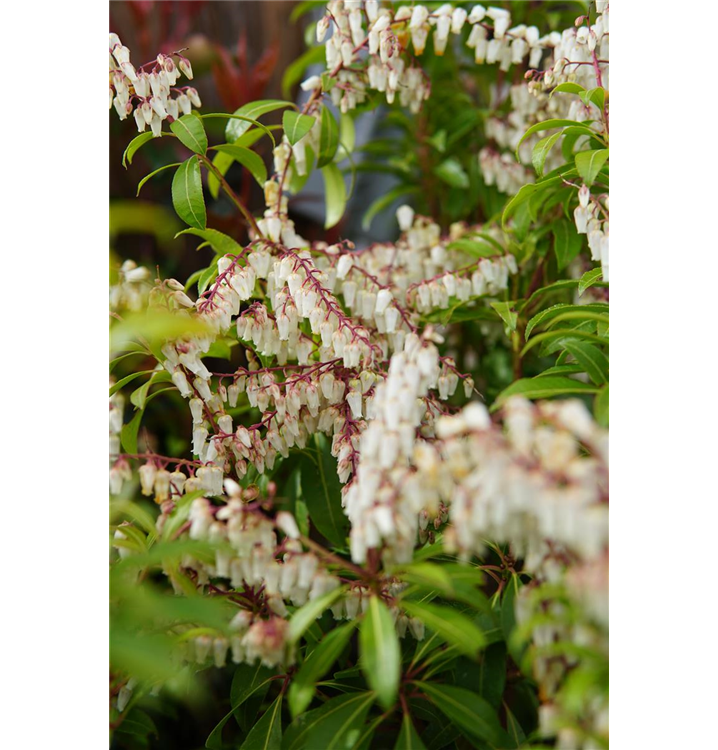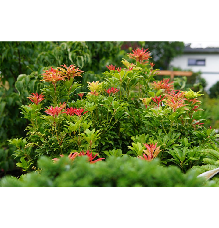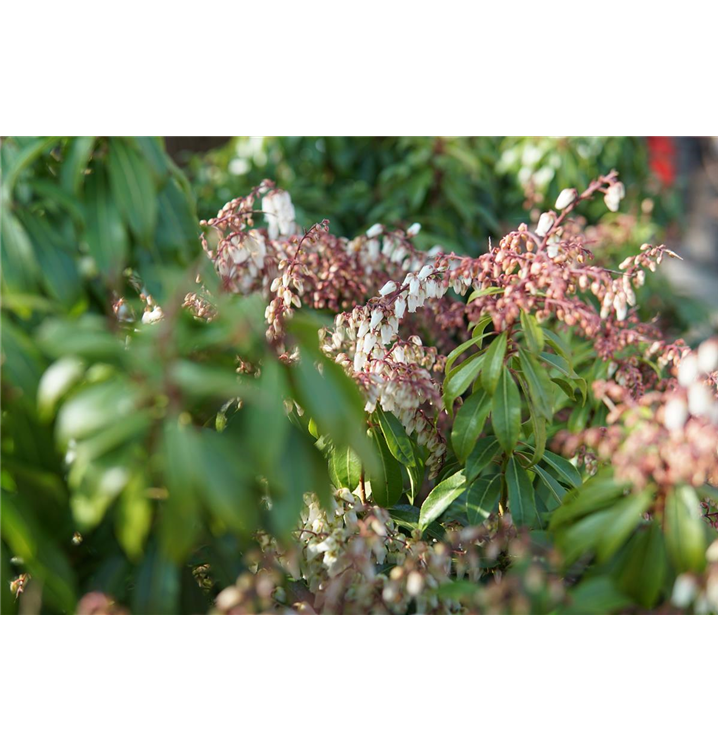 Das Schattenglöckchen 'Mountain Fire' (Pieris japonica) ist ein buschiger, breiter, dichter Kleinstrauch, der weiße, in Rispen angeordnete Blüten hervorbringt. Sie erscheinen von März bis Mai. Besonders dekorativ ist der dunkelrote Jungaustrieb. An einem halbschattigen bis schattigen, windgeschützten Standort mit humosem, nährstoffreichem Boden erreicht es gewöhnlich eine Höhe von ca. 1,3 m und wird ca. 1 m breit.