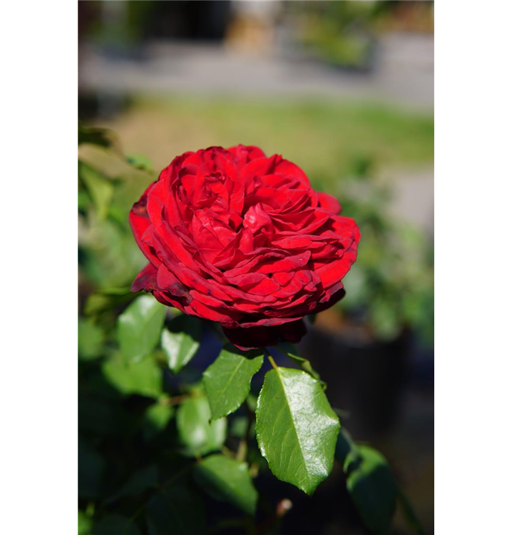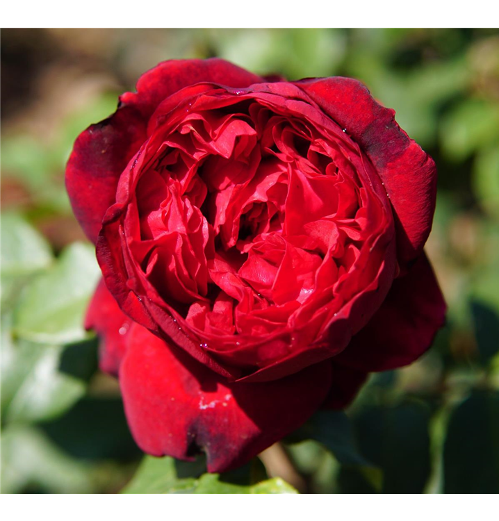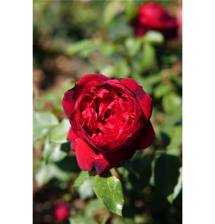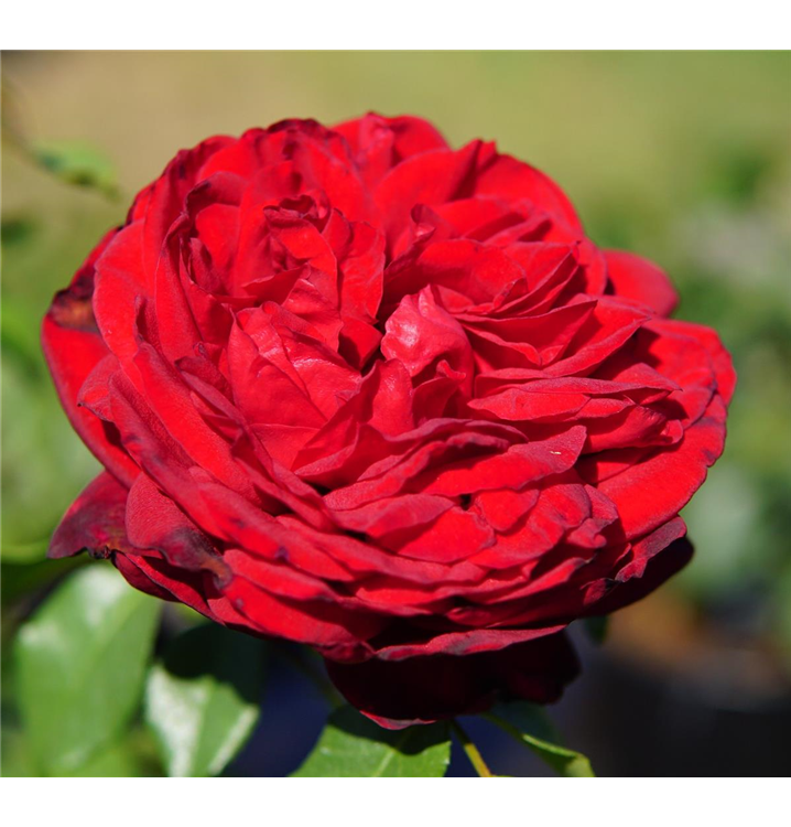 Die samtroten, schalenförmigen Blüten sind starkgefüllt und erscheinen von Juni bis Oktober. Diese werden etwa 12 - 14 cm groß und sind stark duftend.