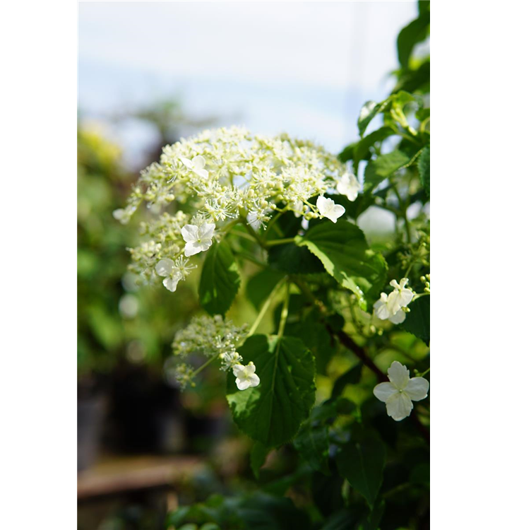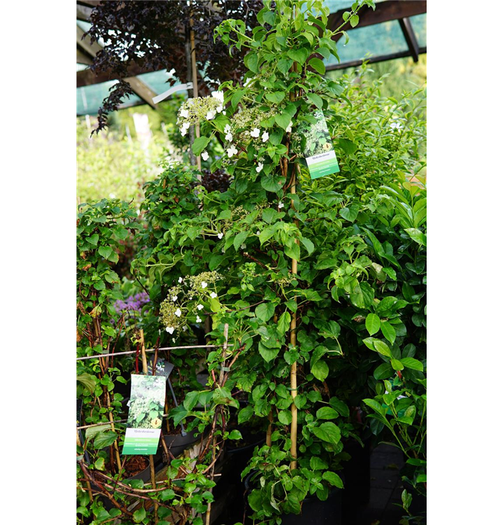 Die Kletterhortensie (Hydrangea petiolaris) ist eine kletternde Gartenpflanze, die weiße, in Rispen angeordnete Blüten mit einem angenehmen Duft hervorbringt. Sie erscheinen von Juni bis Juli. Ihre Rinde ist rot-braun. An einem sonnigen bis halbschattigen Standort mit durchlässigem, lockerem, saurem Boden erreicht sie gewöhnlich eine Höhe von ca. 12 m und wird ca. 4 m breit.