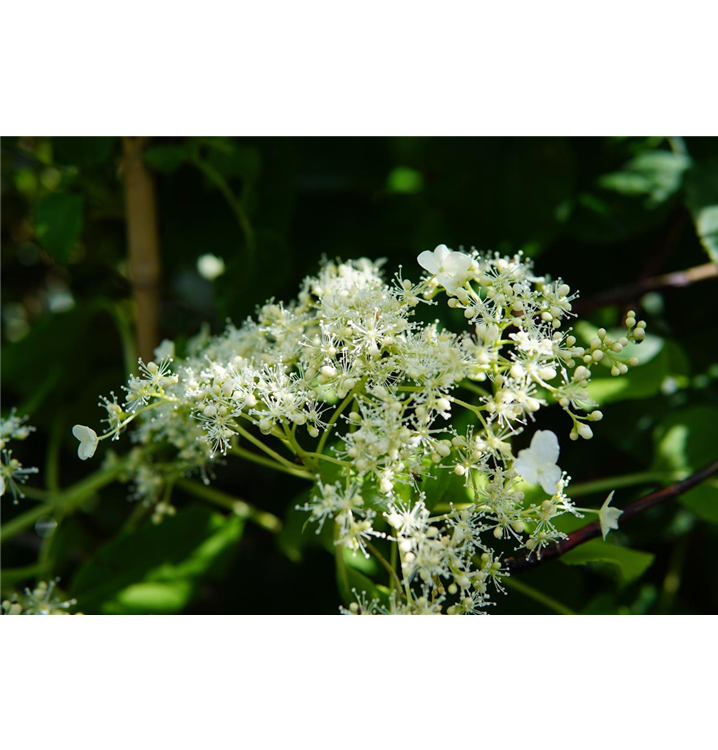 Die weißen Blüten der Kletterhortensie erscheinen in Rispen von Juni bis Juli. Diese sind angenehm duftend.