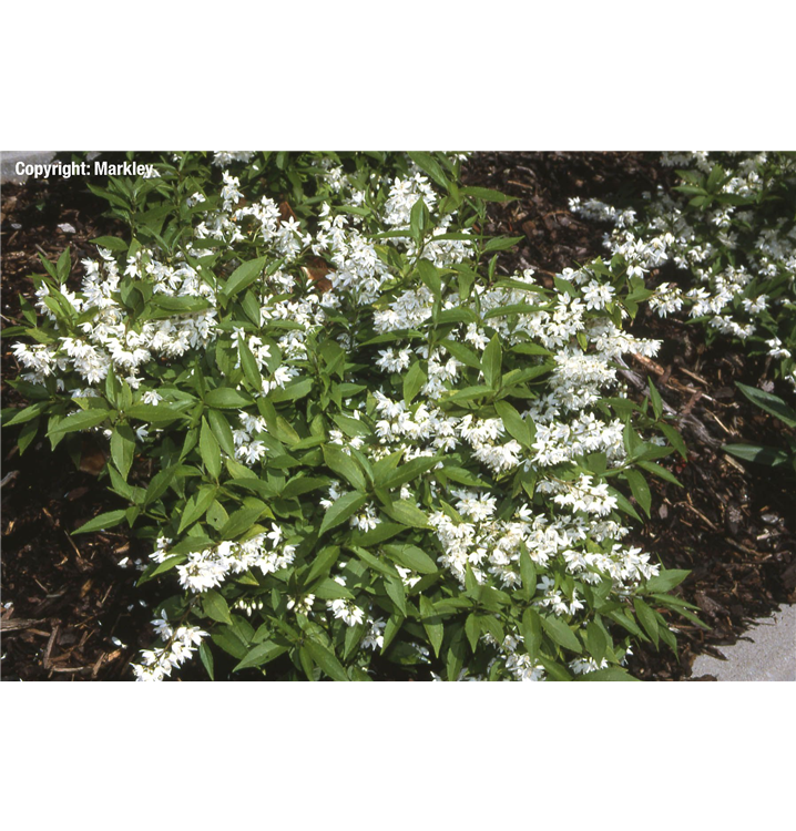Der Maiblumenstrauch (Deutzia gracilis) ein buschiger, aufrechter, dichter Kleinstrauch, der, je nach Sorte, glockenförmige Blüten in verschiedenen Farben hervorbringt. An einem sonnigen Standort mit durchlässigem, nährstoffreichem Boden erreicht er gewöhnlich eine Höhe von ca. 80 cm und wird ca. 1 m breit.