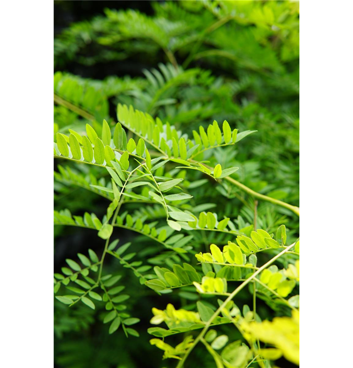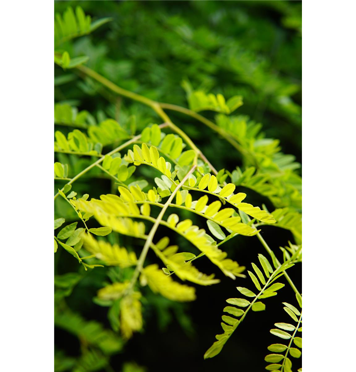 Die sommergrünen Blätter des Lederhülsenbaums 'Sunburst' sind hellgrün, gefiedert. Diese sind etwa 3 - 4 cm groß. Goldgelber Austrieb. Lederhülsenbaum 'Sunburst' zeigt sich leuchtend bernsteingelb im Herbst.