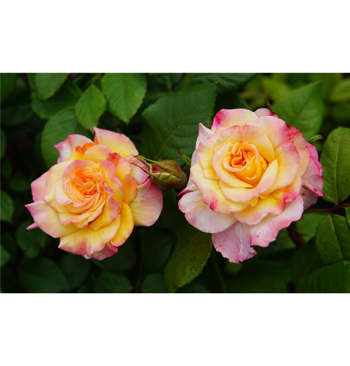 Die sommergrünen Blätter der Edelrose 'Aquarell'® sind dunkelgrün, gefiedert, wechselständig.