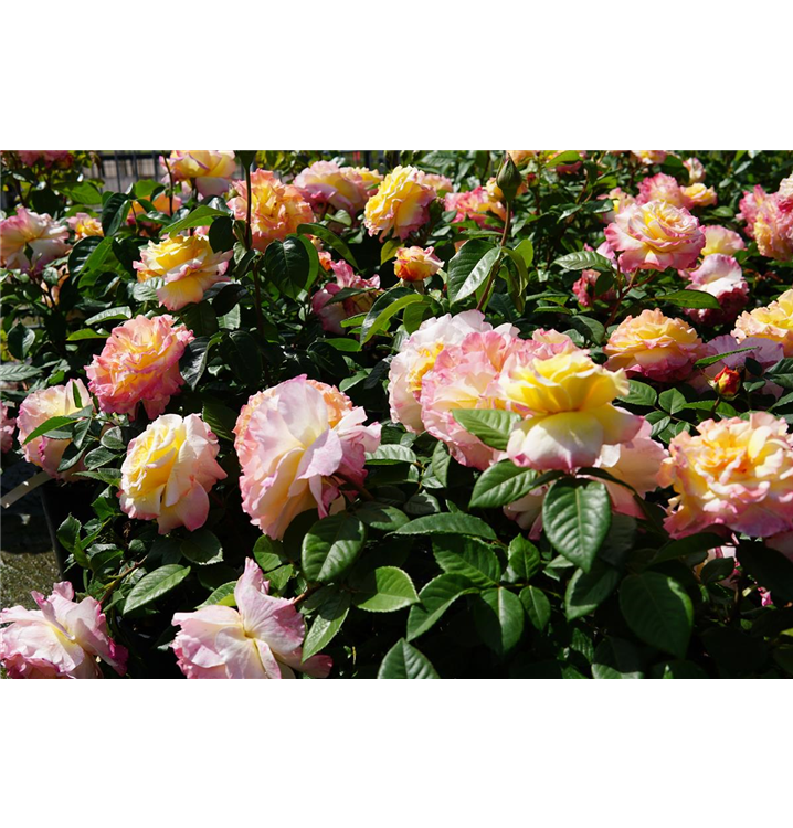Edelrose 'Aquarell'® ist ein buschig und breit wachsender Kleinstrauch, der eine Höhe von 0,8 - 1 m und eine Breite von 60 - 80 cm erreichen kann.