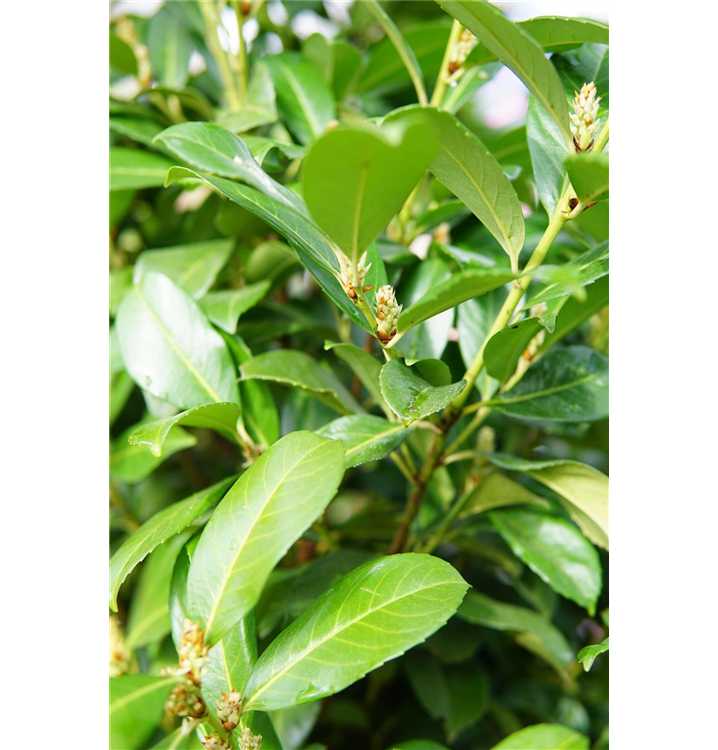 Die Lorbeerkirsche 'Etna'® (Prunus laurocerasus) ist ein buschiger, dichter Strauch, der weiße, in Trauben angeordnete Blüten mit einem starken Duft hervorbringt. Sie erscheinen von Mai bis Juni. Besonders dekorativ ist der kupferbraune Jungaustrieb. An einem sonnigen bis halbschattigen Standort mit durchlässigem, nährstoffreichem Boden erreicht sie gewöhnlich eine Höhe von ca. 2,5 m und wird ca. 1 m breit.