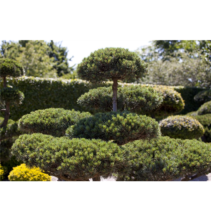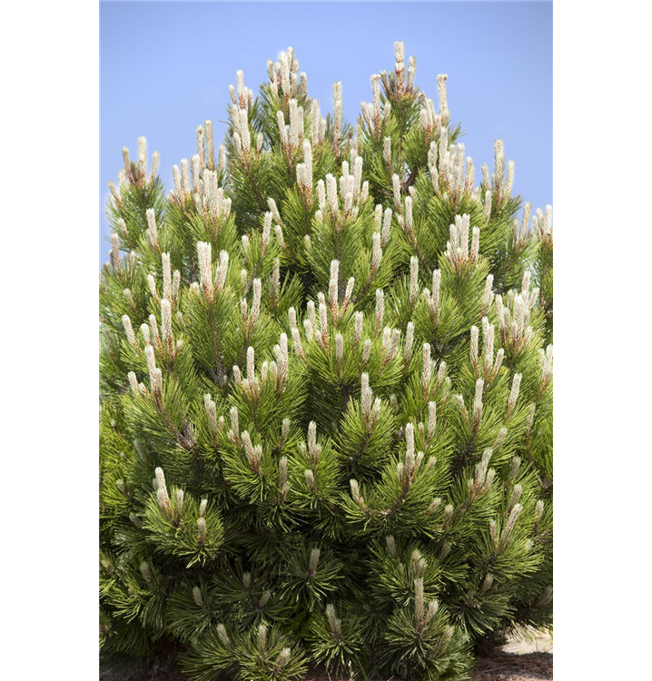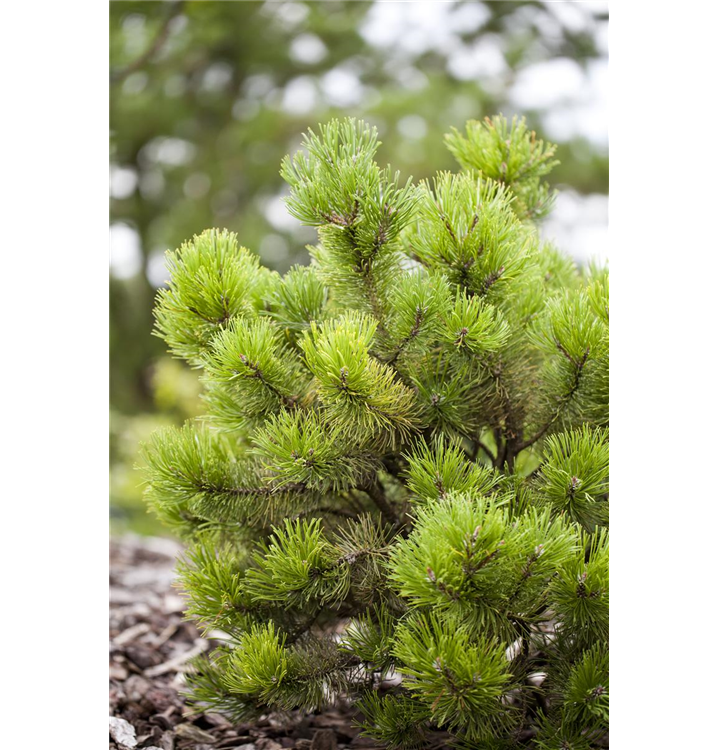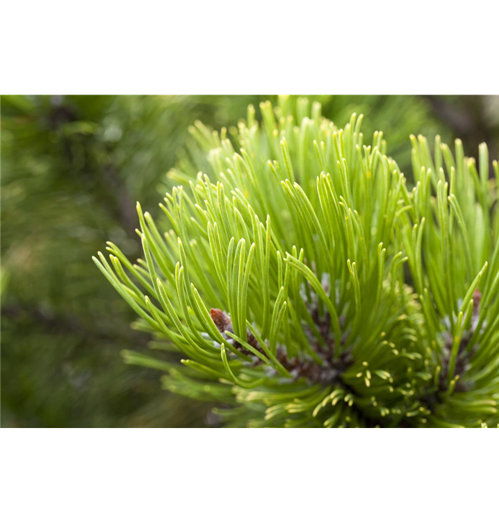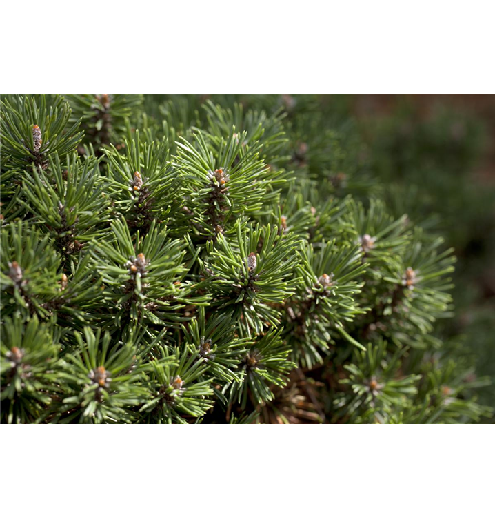 Die Berg-Kiefer (Pinus mugo) ist ein Großstrauch, welcher ausladend, mehrstämmig wächst und gewöhnlich eine Höhe von ca. 6 m und eine Breite von ca. 5 m erreicht. Ihre nadelförmigen Blätter haben eine dunkelgrüne Färbung. Dekorative braun-gelbe Zapfen zieren Pinus mugo ab Oktober. Dieses Gehölz ist gut frostverträglich. Sie bevorzugt einen sonnigen bis halbschattigen Standort. An den Boden stellt die Berg-Kiefer keine besonderen Ansprüche.