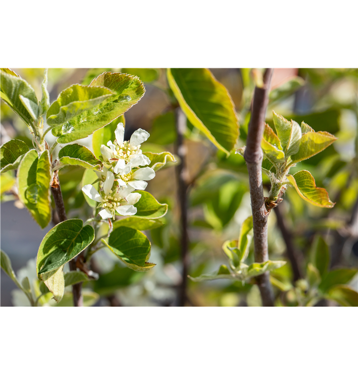 Die sommergrünen Blätter der Felsenbirne 'Northline' sind dunkelgrün, eiförmig.
