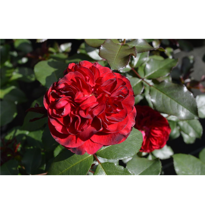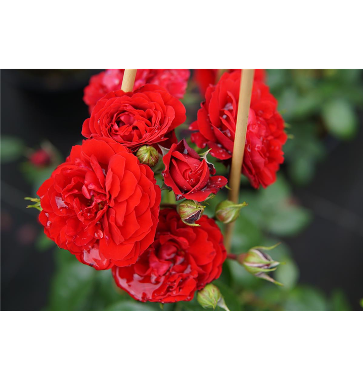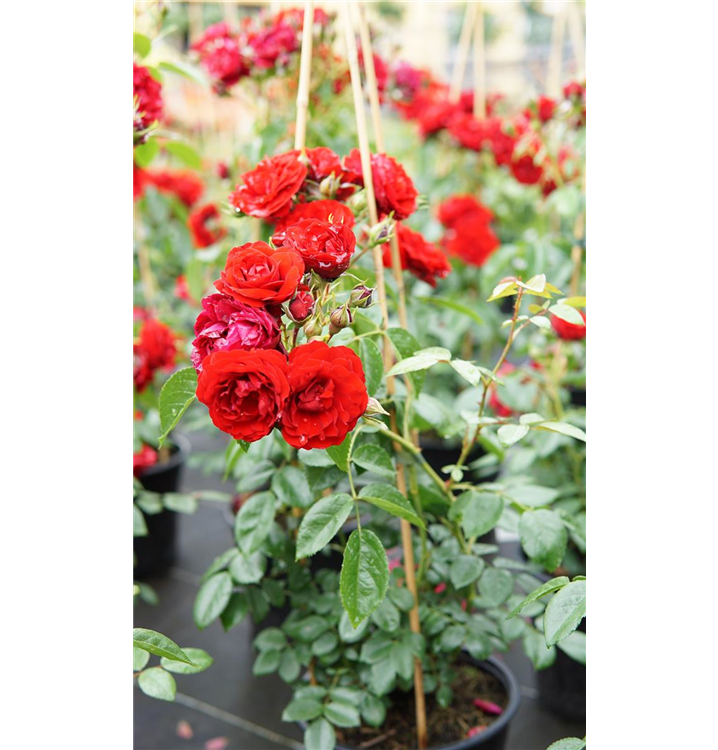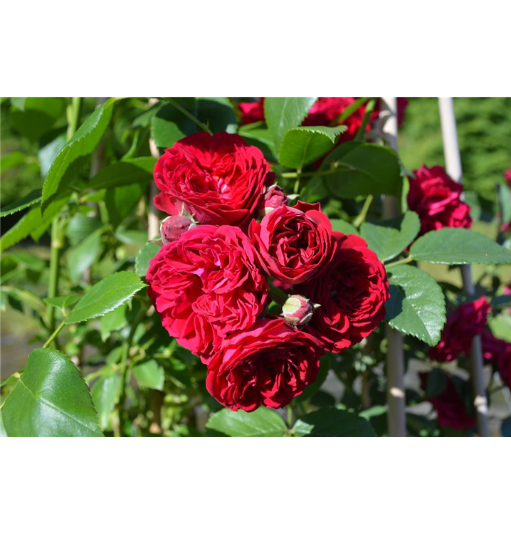 Die Kletterrose 'Belkanto'® (Rosa) präsentiert sich als üppige Blütenfülle im Garten, ihre gefüllten, roten Blüten erscheinen von Juni bis Oktober. Der betörende Duft entfaltet sich besonders an sonnigen, warmen Tagen. In Gesellschaft geeigneter Begleiter erstrahlt die königliche Blume in voller Pracht. Niedrige Stauden, Lavendel und Salbei bieten sich optimal als harmonische Partner an.