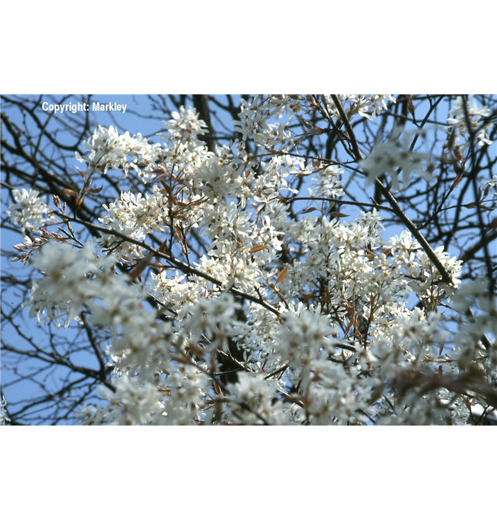 Die Felsenbirne 'Obelisk'® (Amelanchier alnifolia) ist ein säulenförmiger, schlanker Großstrauch, der weiße, sternförmige Blüten hervorbringt. Sie erscheinen von April bis Mai. Besonders dekorativ ist der kupferbraune Jungaustrieb. An einem sonnigen bis halbschattigen Standort erreicht sie gewöhnlich eine Höhe von ca. 5 m und wird ca. 2 m breit. An den Boden stellt die Felsenbirne 'Obelisk'® keine besonderen Ansprüche.