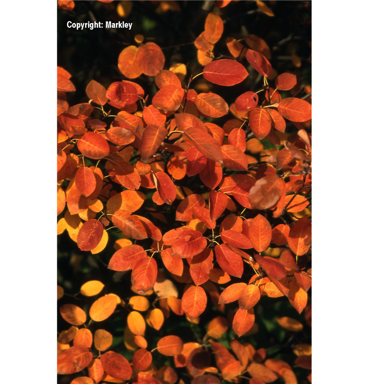 Die sommergrünen Blätter der Felsenbirne 'Obelisk'® sind mittelgrün, eiförmig. Kupferbrauner Austrieb. Felsenbirne 'Obelisk'® zeigt sich leuchtend gelb-rot im Herbst.