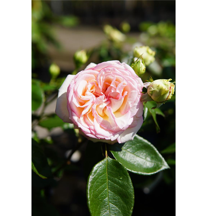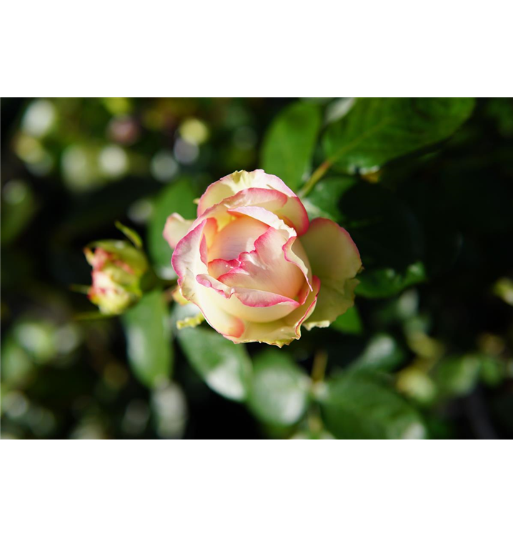 Die Edelrose 'Biedermeier Garden'® (Rosa) ist eine reichblühende Rose, die im Garten eine besondere Rolle spielt. Die zahlreichen gefüllten Blüten sind weiß-rot und erscheinen von Juni bis Oktober. Ihr wunderbarer Duft entfaltet sich besonders an sonnigen, warmen Tagen. Mit den richtigen Begleitern an ihrer Seite, kommt die Königin der Blumen besonders gut zur Geltung. Niedrige Stauden, Lavendel und Salbei eignen sich ganz gut für diese Zwecke.