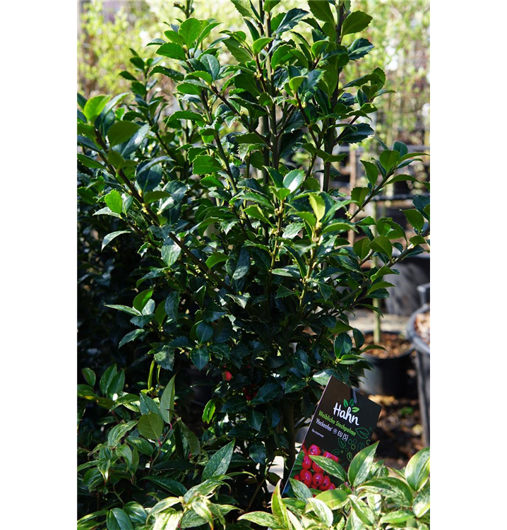 Die Stechpalme 'Heckenfee'®(s) (Ilex meserveae) ist ein aufrechter Strauch mit dekorativen, roten Früchten. Die grün-weißen Blüten erscheinen von Mai bis Juni.